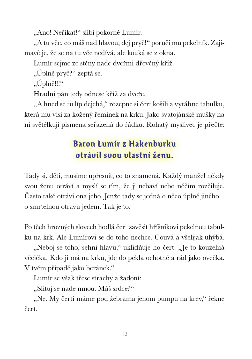 Nazval jsem tuhle knížku Čerti nejsou, abyste se jí nebáli, ale oni tam jsou, a to dokonce tři. Je to však pohádka o lidech, kteří se měli rádi a málem o tu lásku přišli. A taky o dvou dětech, které měly zlého tatínka a nevěděly, jak se to mohlo stát. Chvílemi je to smutné, chvílemi veselé, jak to v životě bývá. Všechno se to odehrává na hradě Hakenburk.