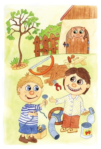 Děda jim dal krabičku plnou hřebíků, drát, kladívko, asi sedm prkýnek a volant od traktoru. Kluci ještě našli velkou plechovku, kousek roury a starou kliku od dveří. Uprostřed dvora se potom pustili do díla. Přitloukali prkýnka k bedně tak, aby to vypadalo jako křídla. Několik hřebíků sice ohnuli a párkrát se bolestivě praštili, ale nakonec dřevo pevně drželo. Přidrátovali také volant, kliku a rouru.