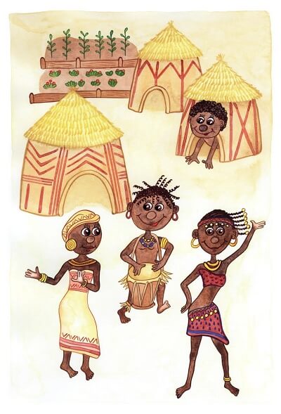 Vtom venku zaslechli zvuky bubnů, zpěv a smích. Na udusané návsi se tančilo. Afričané milují hudbu a tanec. Kluci si vesele podupávali spolu s nimi. Docela jim to šlo. Potom poděkovali za krásnou vyřezávanou masku, kterou jim Togo daroval. Rozloučili se a spěchali domů. Však už byl čas. Babička právě vyšla na zápraží a volala je.