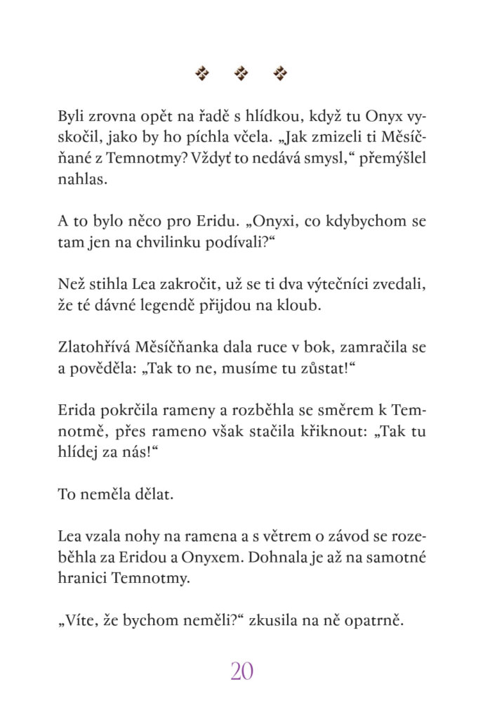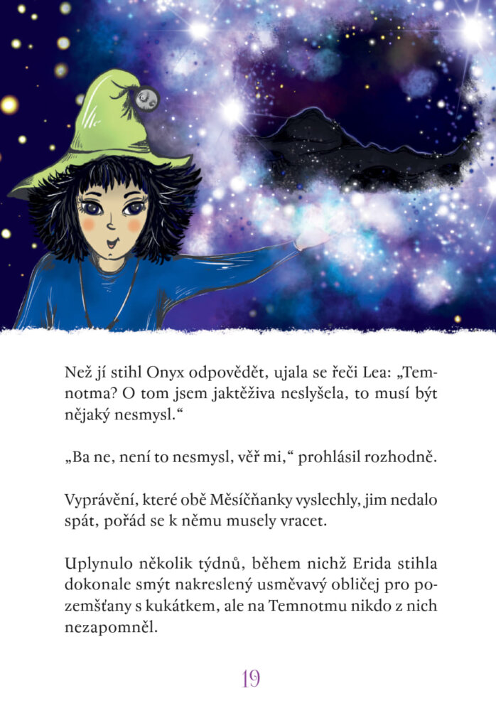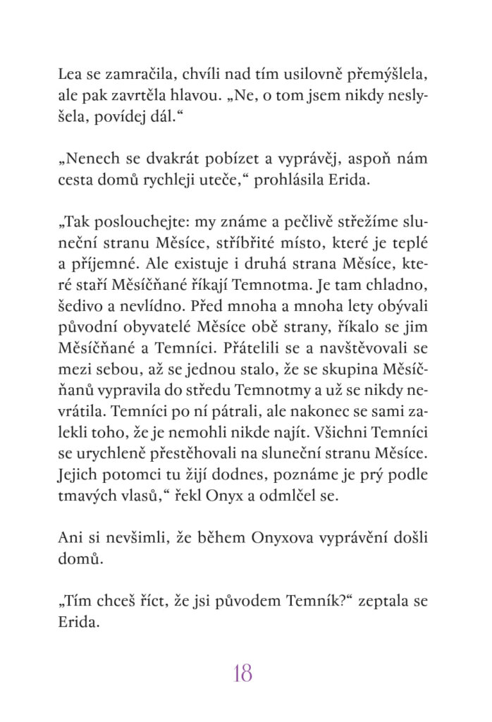Lea, Erida a Onyx jsou Měsíčňané. Jsou to drobné bytosti, které žijí na sluneční straně Měsíce. Všichni Měsíčňané mají důležité poslání, totiž ohlídat, aby sluneční paprsky neutekly. Leu, Eridu a Onyxe ale hlídkování nebaví. Zato záhady a průzkumy, to je jejich. A když se tedy dozvědí o skupině, která zmizela na temné straně Měsíce, rozhodnou se přijít této záhadě na kloub.