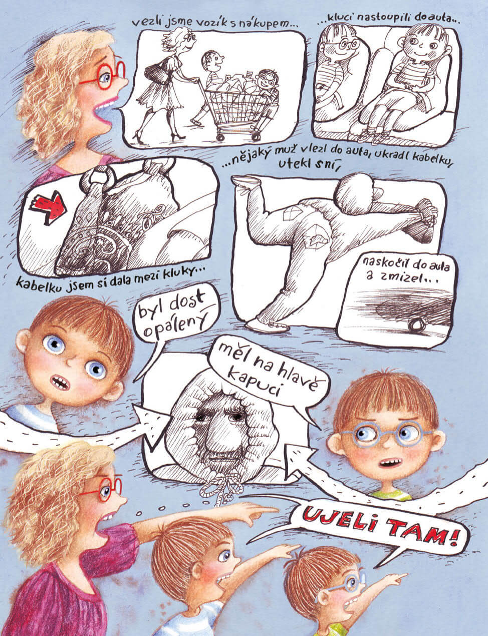 Když našli zaparkované auto, maminka zmáčkla tlačítko na dálkovém ovladači. Kluci nastoupili dovnitř, sedli si vzadu každý na své místo a maminka si mezi ně uložila svou kabelku, aby jí nepřekážela při ukládání tašek do kufru auta. Když byla maminka zabraná do nakládání nákupu, stala se zvláštní věc. Odněkud z křoví se vynořil nějaký chlápek a skočil k autu. Rychle chňapnul po kabelce, a než se kluci stačili odpoutat nebo něco říct, zase vyskočil. Maminka byla v šoku. Strnule hleděla na muže prchajícího s její kabelkou. Když se vzpamatovala a začala volat o pomoc, bylo pozdě. Ze zatáčky se vyřítilo černé auto s tmavými skly. Přibrzdilo, aby do něj mohl lupič nasednout, a pak zase odfičelo.