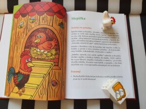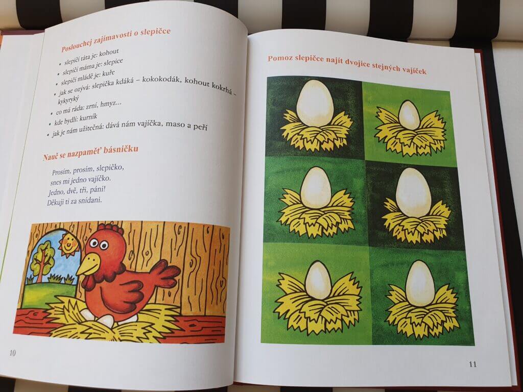 Na knize se mi moc líbí její interaktivita. Děti si nejprve vyslechnou krátký příběh o příslušném zvířátku, přečtou si zajímavosti a mohou se naučit básničku. Poté už je čekají úkoly – hledají stejná vajíčka, počítají kosti pro pejska, hledají červené kytky či myšku ukrytou před kočkou. Na závěr kapitoly je ke každému zvířátku připraven obrázkový příběh, který mohou děti zkusit samy vyprávět, není třeba, aby uměly číst.