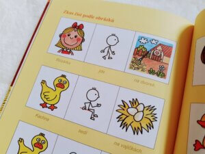 Malované čtení známe z časopisů, zde ale obrázek nesuploval jen slovo, nýbrž celou větu. Dcera s tím trošku ze začátku bojovala, hlavně slovesa neuměla odhadnout. Ale obrázky jsou v podstatě podobné a stále dokola, takže na konci knížky už uměla “přečíst” mnohem lépe.