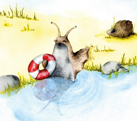„Uááá!“ vykřikl Palmác úlekem. Z vody na něj vybafl další šnek, hlemýžď nebo slimák. To Palmác hned nepoznal, protože ten cizí tvor měl nad vodou taky jenom hlavu. A taky se polekal a zmizel.