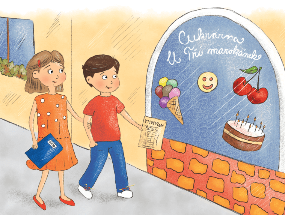 „Snad tam bude místo,“ strachovali se. Záhy však zjistili, že úplně zbytečně. Bylo deset hodin dopoledne a cukrárna teprve otvírala. „Vždyť jsme dnes ve škole moc dlouho nebyli,“ usmáli se a už se hnali ke stolku s rohovou lavicí a pěkným výhledem na náměstí.