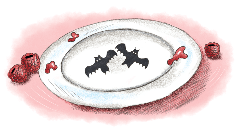 „Podívej!“ vykřikla zničehonic Gába, až se zakuckala posledním soustem palačinky. Ukazováčkem umazaným od malinové šťávy šermovala nad svým talířem, na kterém se vyjímal obrázek dvou černých netopýrů. Nemohla z nich spustit zrak.