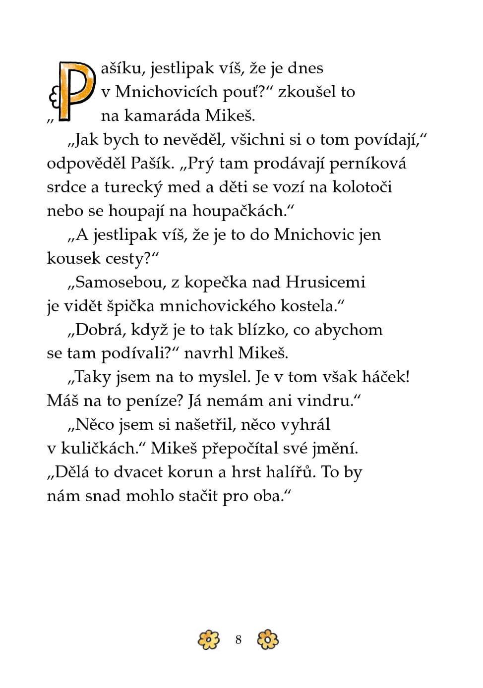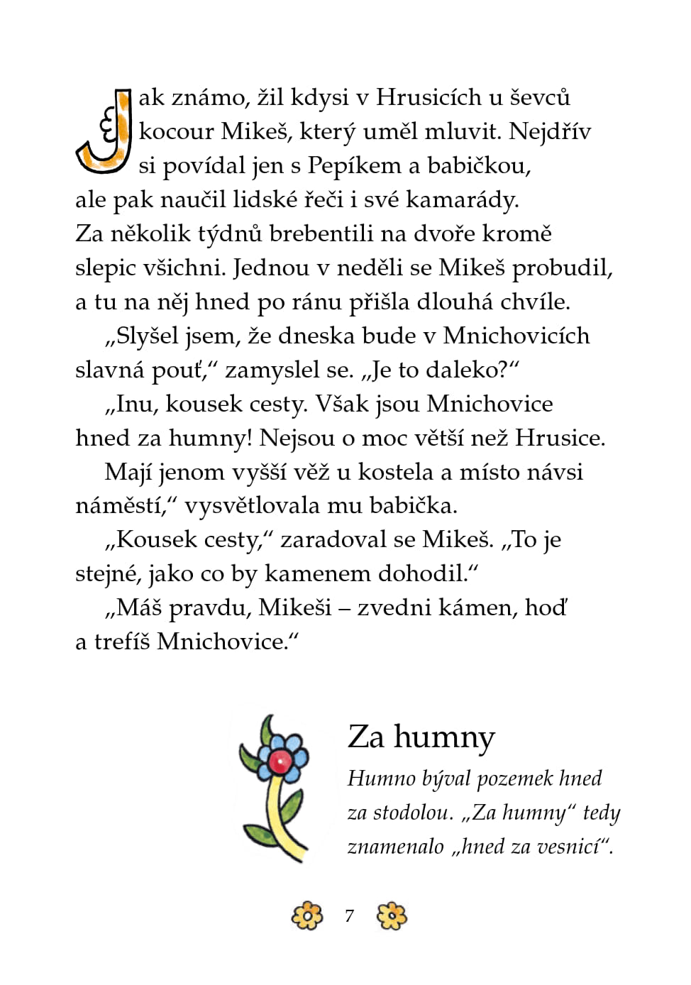 Byl jednou jeden černý kocourek jménem Mikeš, který nosil vysoké boty a uměl mluvit. Toho ovšem všichni moc dobře znáte. Věděli jste ale, že na pouti s kamarádem Pašíkem jezdil na motorce? A že se stal hlavní hvězdou cirkusu? Chcete vědět, co je to vindra a frkačka? Nebo co znamená, když se řekne „za humny“? Nejen to, ale i leccos navíc se dočtete v nových převyprávěných dobrodružstvích nejslavnějšího českého kocoura, která udělají radost i těm nejmenším čtenářům.