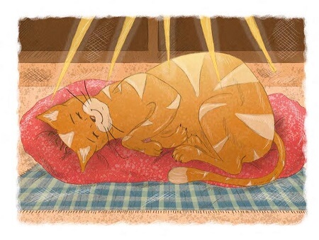 Mína se líně protahuje v pelíšku. Právě se převalila na druhý bok. Je to velice příjemné. Sluníčko ohřívá její mourovatý kožíšek. Nejprve z jedné strany. A teď i z druhé. Mína přemýšlí, že se za chvíli, až bude mít tuto část kožíšku prohřátou, převalí na záda a nechá si nahřívat i bříško. Pak si nechá prohřát kožíšek na zádech a potom se třeba zase převalí na pravý bok a pak zase na levý. Lenošení je zkrátka moc prima. Mína by mohla prolenošit třeba celý, celičký den.