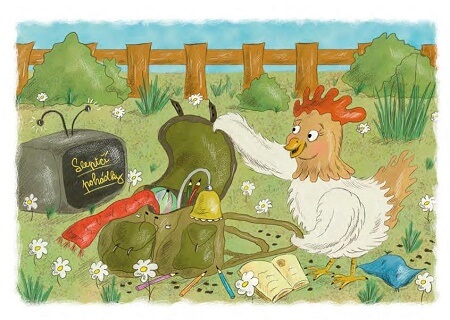 „Slepičky,“ poučuje vážně své kamarádky Tuli, „jdeme jenom na výlet, nemůžete si s sebou brát všechno, co vás napadne. Je důležité dobře si rozmyslet, co opravdu budete na výletě potřebovat. Vždyť byste všechno ani neunesly. Vezměte si s sebou vodu a nějakou svačinku. To bohatě stačí.“