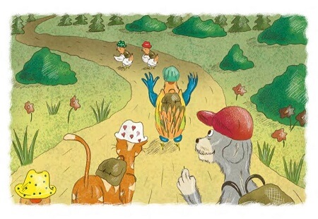 A tak pejsek Tuli, kočka Mína, kohoutek Kyky, slepičky Ďobka, Zobka a Ťopka jdou na svůj první výlet.