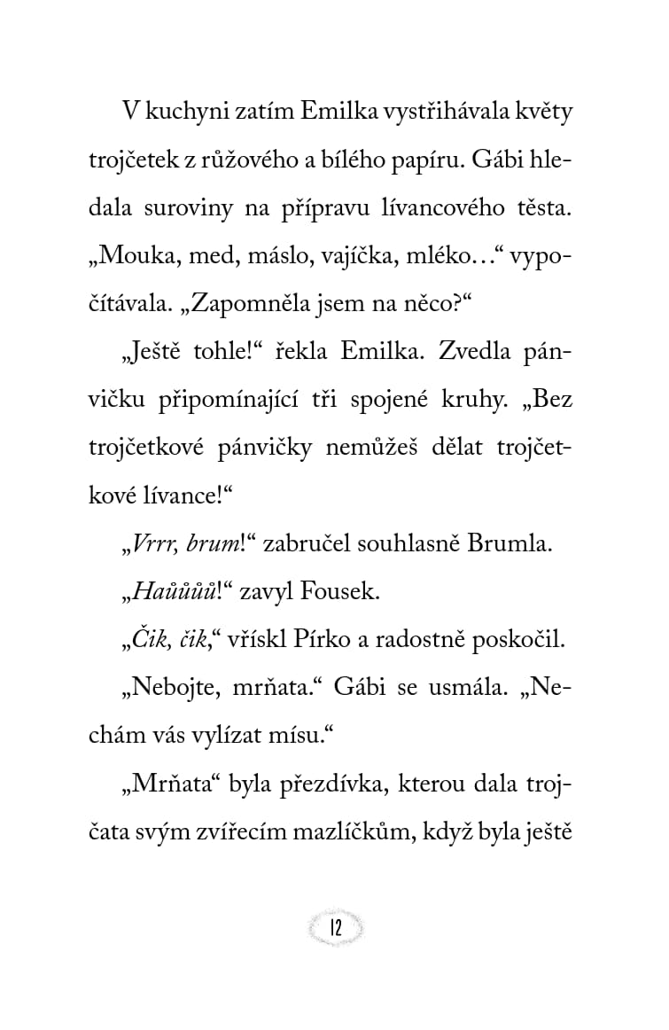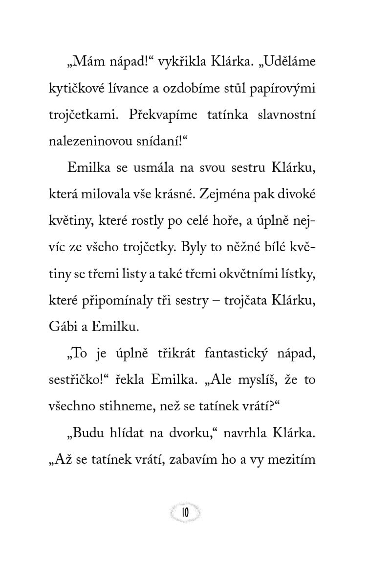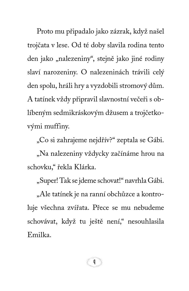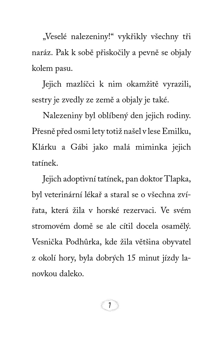 Trojčata Emilka, Gábi a Klárka žijí ve stromovém domě v lese se svým malým bráškou Tobíkem a tatínkem doktorem Tlapkou, který pomáhá zvířatům. Rodinka právě slaví „nalezeniny“ – tatínek totiž dívky před osmi lety