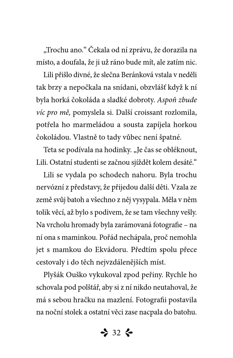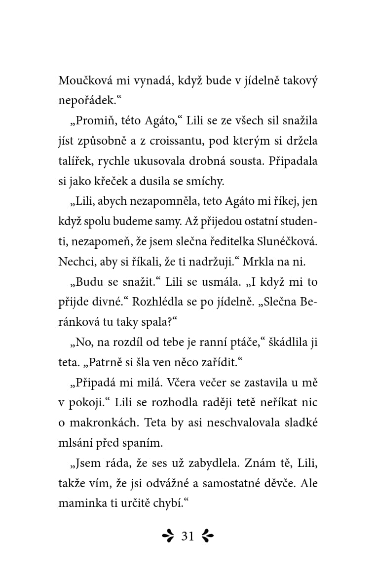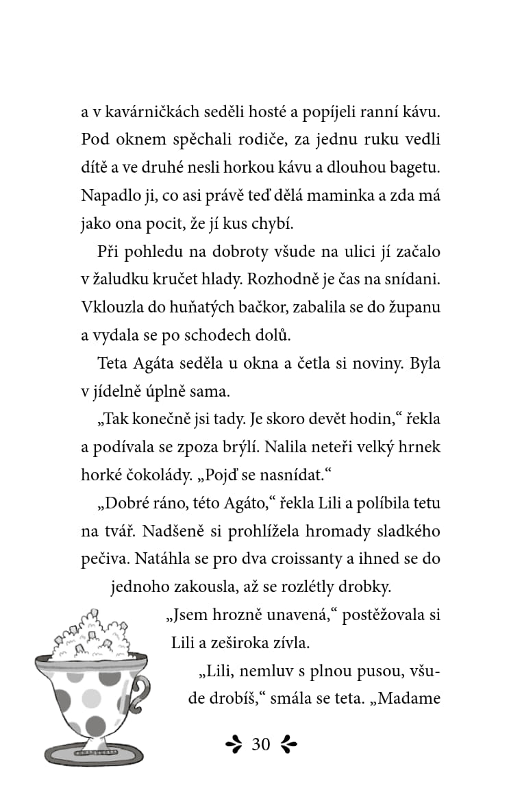 Lili je velká milovnice záhad a právě odjíždí do Paříže do nové školy, kterou provozuje její teta Agáta. Všechno se ale zašmodrchá, když je teta obviněna z krádeže drahé brože v jednom pařížském zlatnictví. Lili má naštěstí skvělou kamarádku Káju a hlavně dokonalý pozorovatelský a detektivní talent. A kolem se potlouká podezřelá dáma v klobouku s pavím perem…