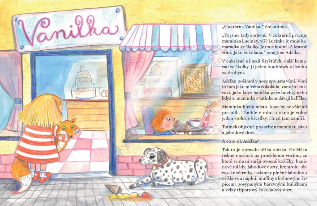 Dnes je Den dětí a Adélka s maminkou a tatínkem jdou do cukrárny, aby svátek pořádně oslavili. Je tady tolik dobrot! Příjemné odpoledne v cukrárně ale končí a na děti ještě čeká na náměstí program plný soutěží. Adélka spěchá, aby vše stihla, také paní cukrářka už zamyká a obchod je prázdný…