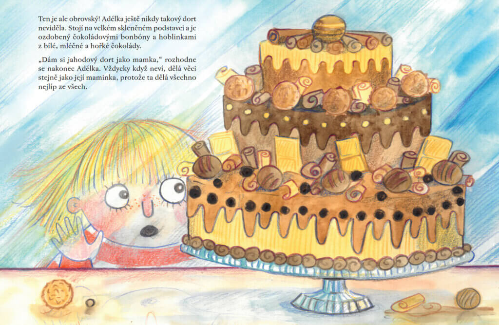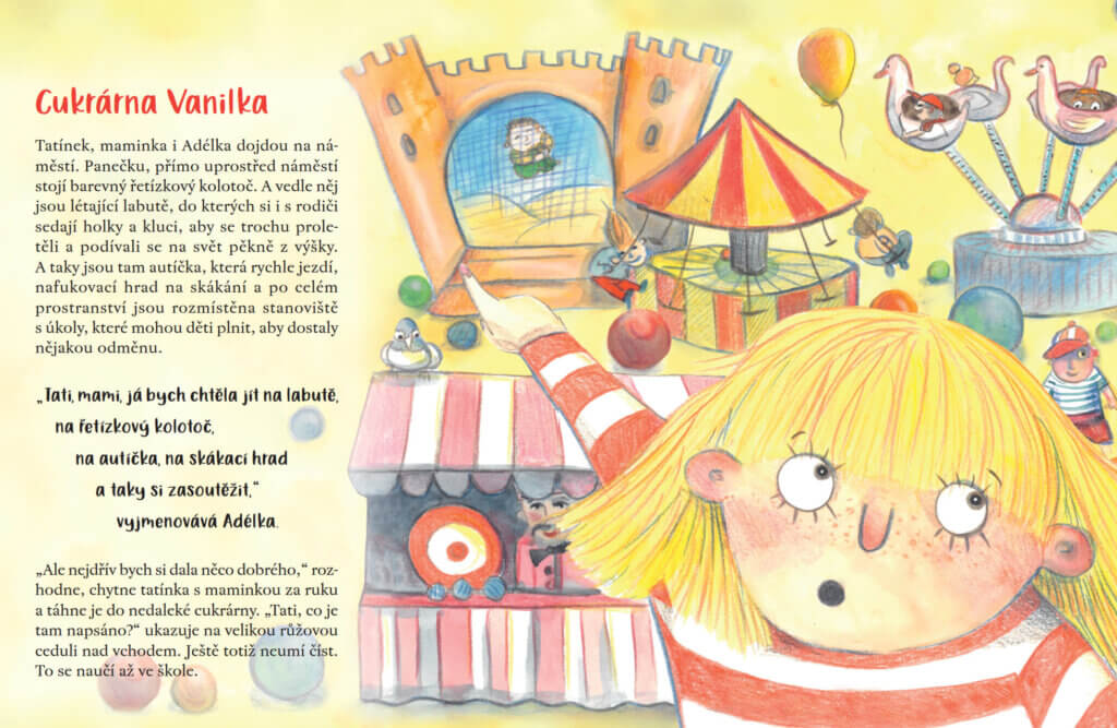 Dnes je Den dětí a Adélka s maminkou a tatínkem jdou do cukrárny, aby svátek pořádně oslavili. Je tady tolik dobrot! Příjemné odpoledne v cukrárně ale končí a na děti ještě čeká na náměstí program plný soutěží. Adélka spěchá, aby vše stihla, také paní cukrářka už zamyká a obchod je prázdný…