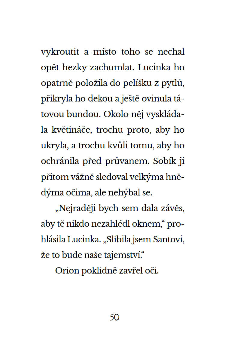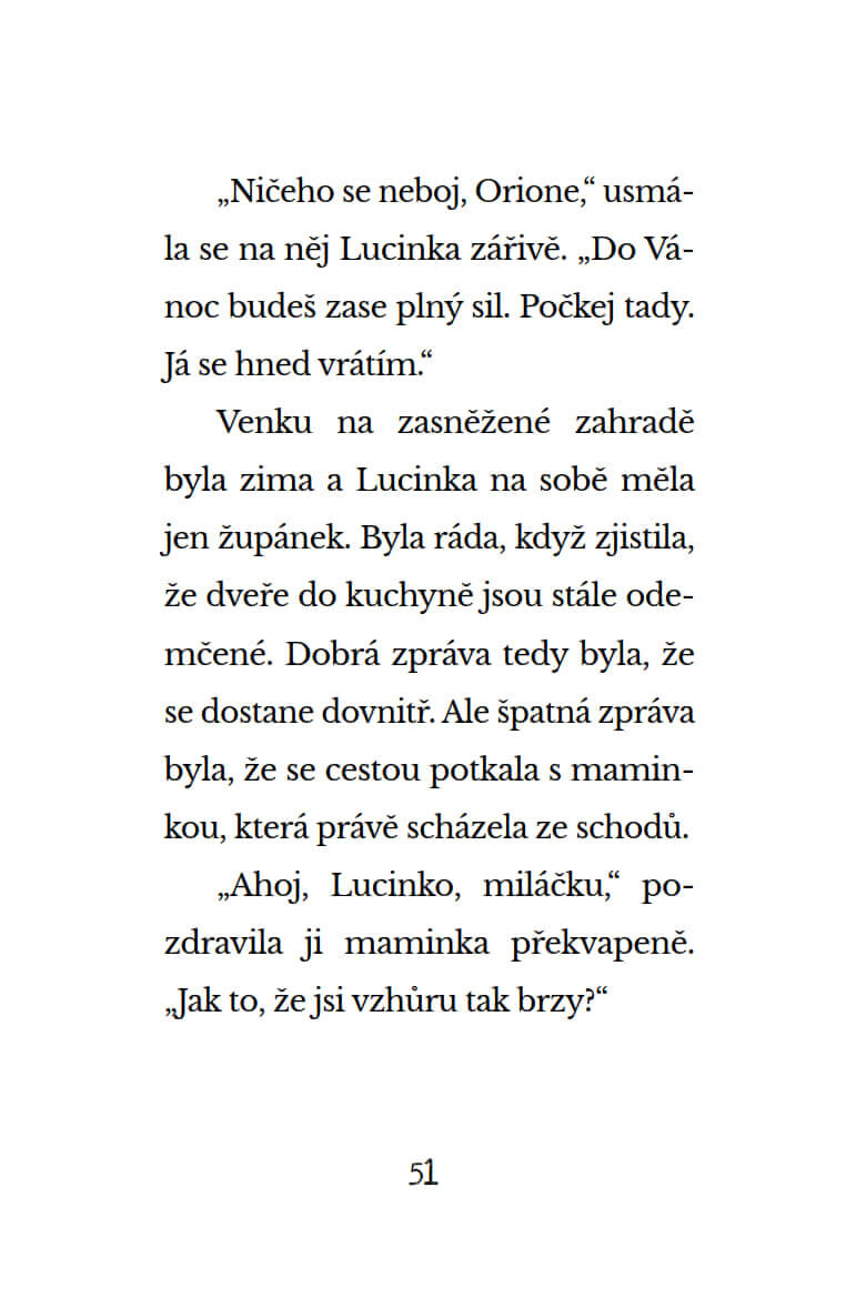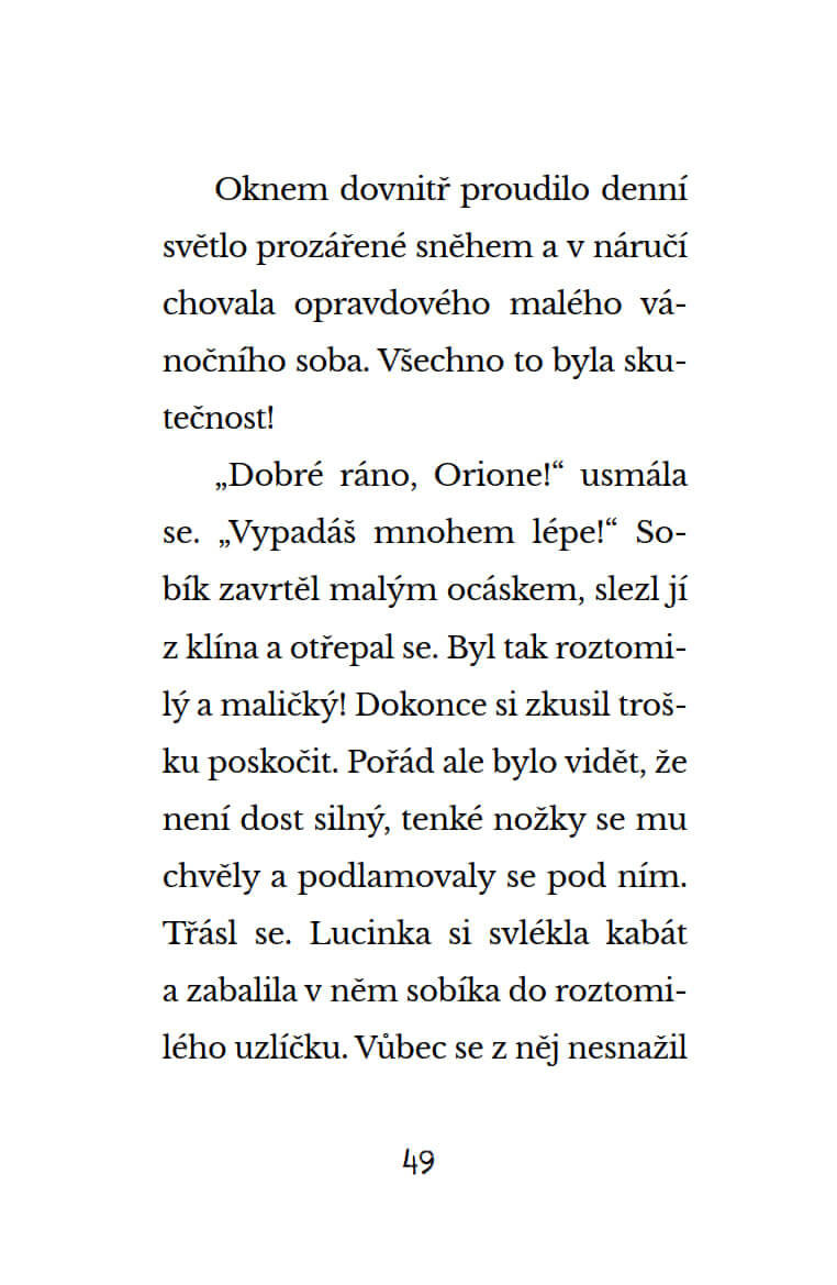 Kouzelný zimní příběh pro vánoční pohodu! Lucinka má jedno velké tajemství – Santa jí nechal v zahradním přístřešku malého soba! Sobík Orion je totiž nemocný, a pokud se včas neuzdraví, Santa nebude moct doručit žádné vánoční dárky. Podaří se Lucince Oriona uzdravit a zachránit všem Vánoce?