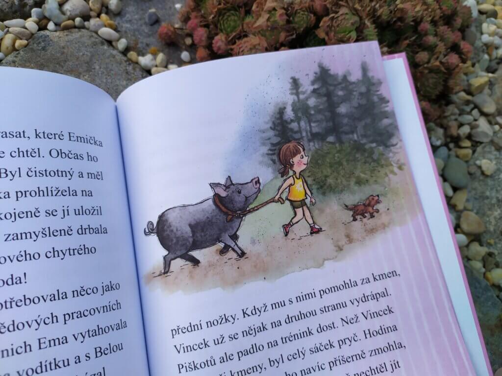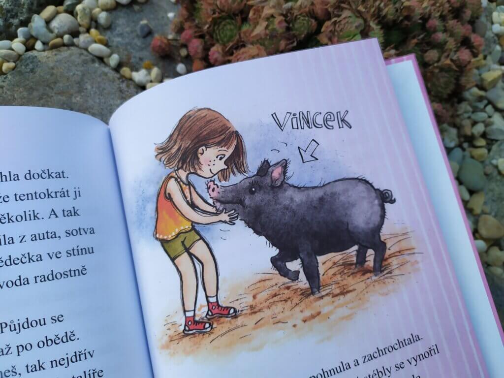 Malá Ema jezdívá samozřejmě i k babičce a dědečkovi na venkov. A to moc ráda! Vždyť tam o zvířata není nouze. Měli králíky, slepice a tři kočky. A vždy, když Ema přijela na návštěvu, měli babička s dědou nějaké nové zvíře. Letos ji tam čekalo černé prasátko. ´“Jmenuje se Vincek,“ smál se pyšně děda.´ A v rybníku měl dokonce zlatého kapříka Fanouše.