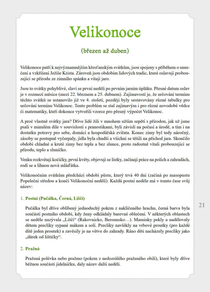 O více i méně známých lidových tradicích či obyčejích najdete v knížce krátké povídání, doprovázené tematickými ilustracemi a obrázky k vymalování. Vánoce a Velikonoce jsou navíc doplněny tradičním rodinným receptem, který si můžete vyzkoušet.