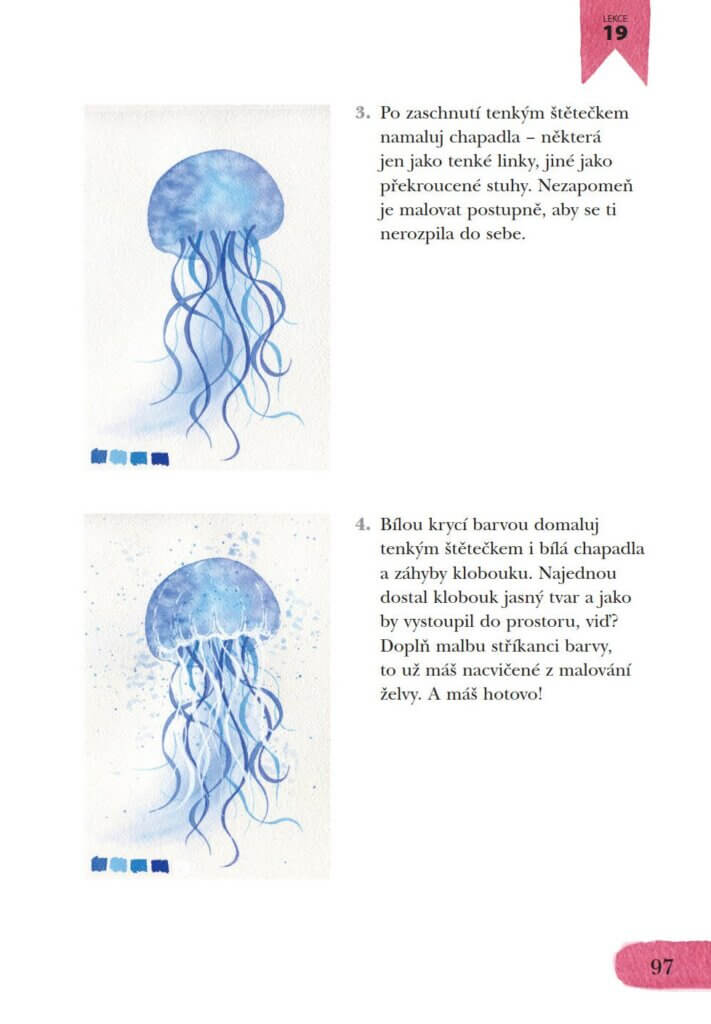 V praktické části se podle podrobných návodů naučíte malovat zajímavou mozaiku, barevné květy, dechberoucí západ slunce, vlnící se moře, ovoce k nakousnutí nebo třeba hrníček, ze kterého budete mít chuť se napít.