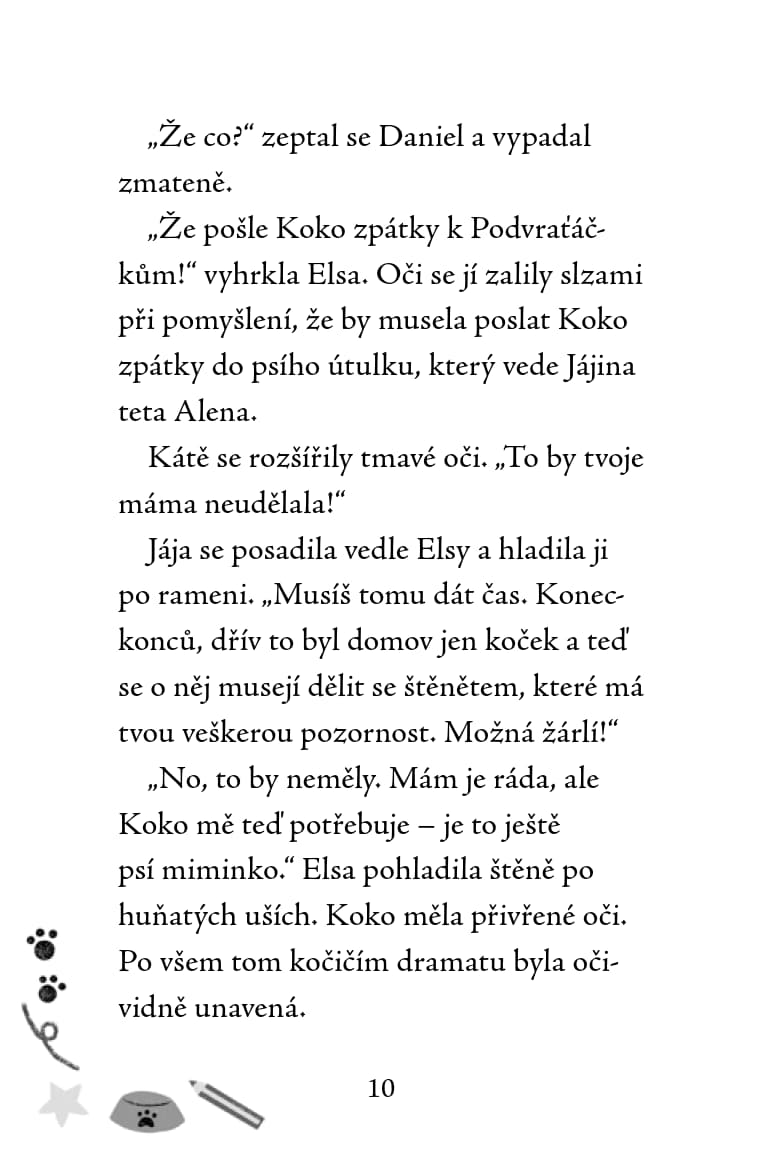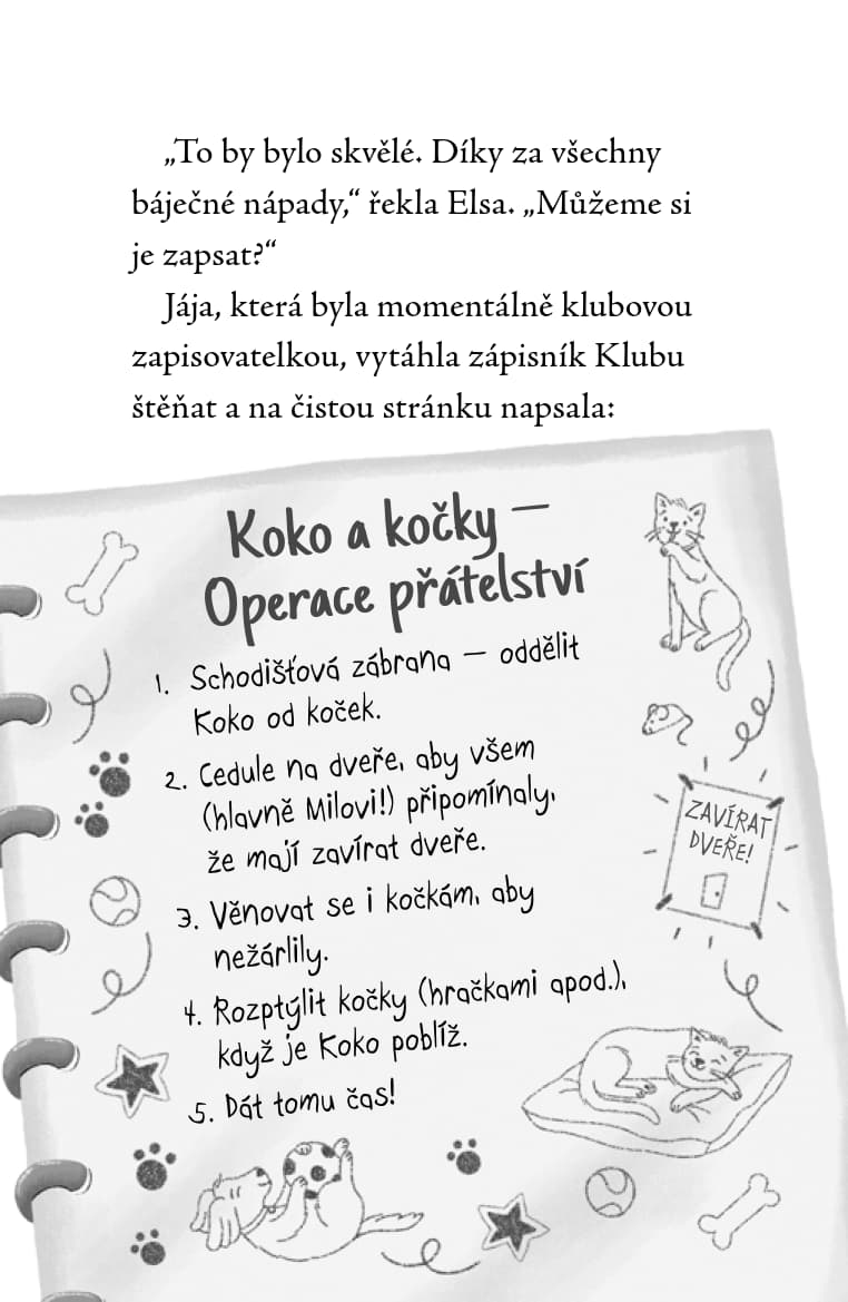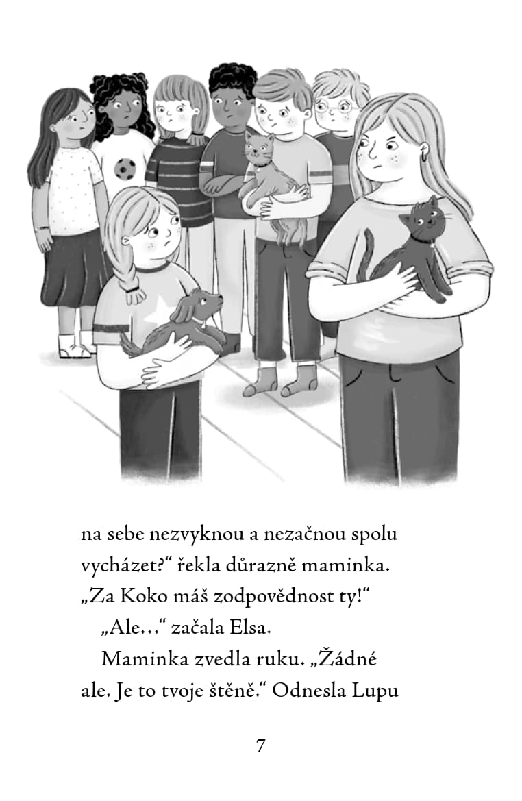 Naštěstí má Elsa kamarády Jáju, Káťu, Daniela, Artura a Helču, kteří rádi pomohou. Úkol je jasný – vymyslet plán, jak kočky spřátelit se štěnětem. Ale jde to vůbec?