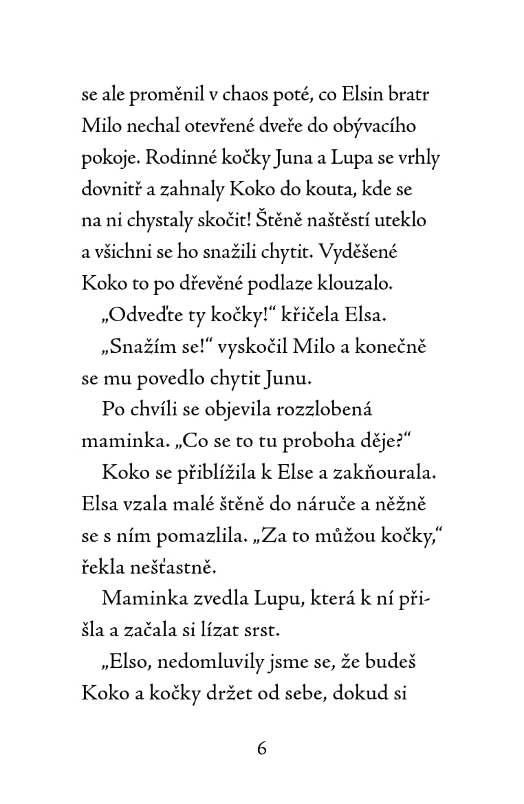 Elsa nade vše miluje svou malou fenku Koko. Ale starat se o ni není tak snadné, jak si zprvu myslela – štěně zlobí, všechno rozkouše, a navíc se s ním neskamarádily dvě domácí kočky, které ho považují za vetřelce. Pronásledují vyděšenou fenku po celém domě. Hotová pohroma! A maminka se zlobí…