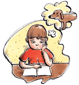 Matěj si povzdychl. Kočka je moc holčičí, ta by ho určitě nebavila. Co žába? Ještěrka? Nebo koza? S tou by byla docela určitě legrace. „Ach jo, kdybych tak měl alespoň psa,“ zamumlal si pro sebe a sklonil se nad papír. „Už to mám! Napíšu o pejskovi.“ A taky si umínil, že až přijde domů, poprosí rodiče, jestli by mu psa pořídili.
