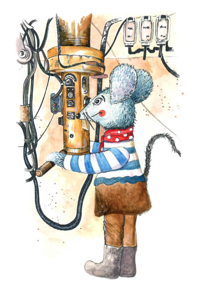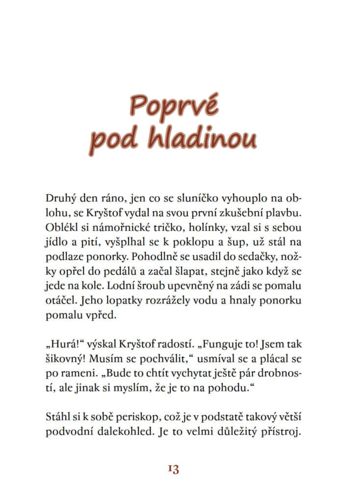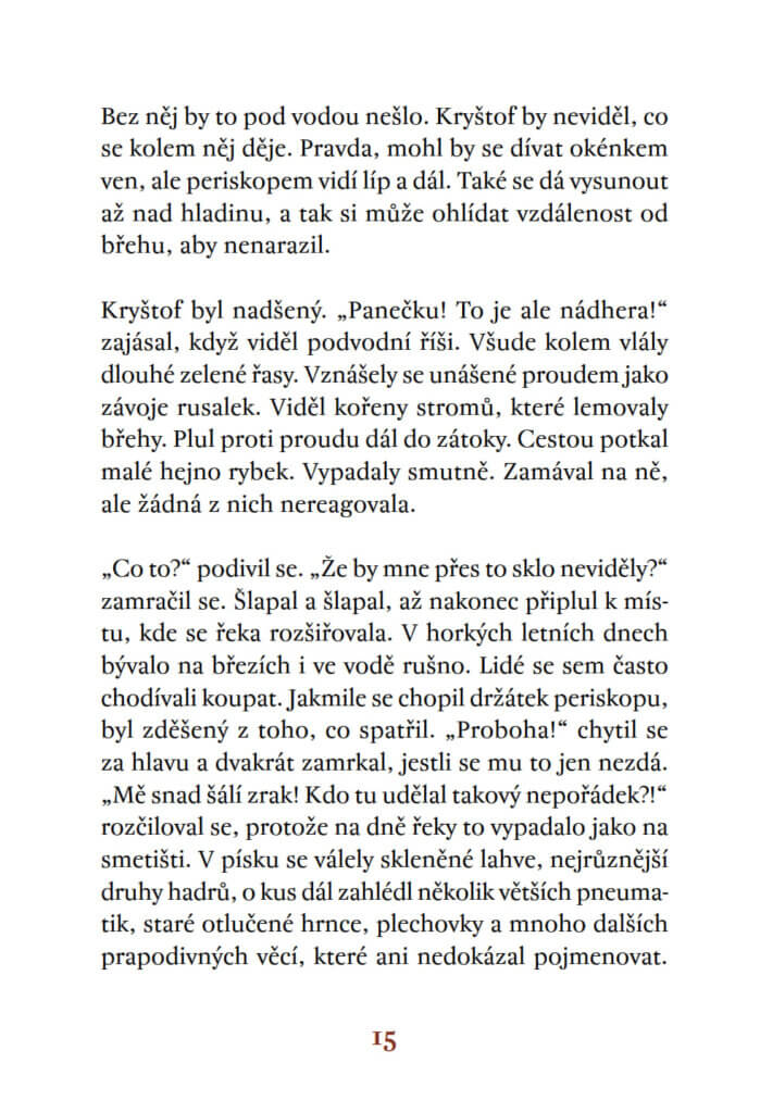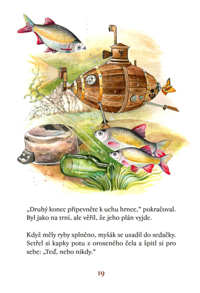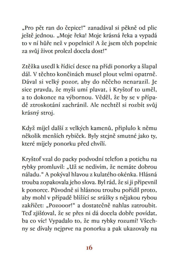 Největším snem myšáka Kryštofa je podívat se, co se skrývá pod hladinou řeky. Jednoho dne objeví na břehu malou ponorku. Dětskou hračku tak akorát velkou pro myšáka. Zbývá ji jen opravit, doplnit zásoby a může se pustit do odvážného vodního dobrodružství.