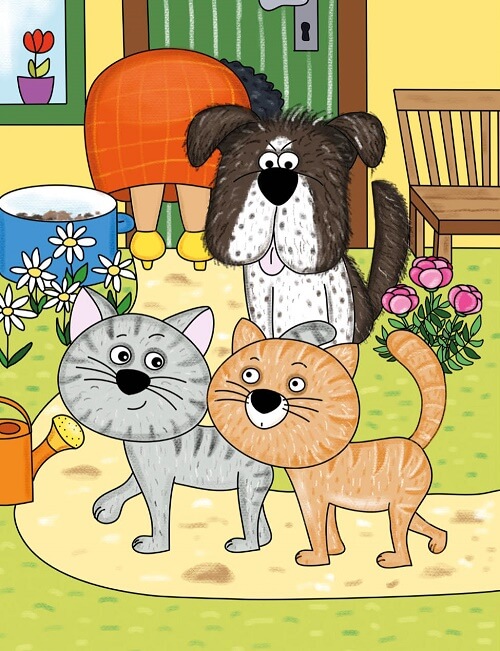 „Jen jestli uživíš i mě!“ posteskl si pan Mikulka a šel zjistit, jestli bude něco k večeři. Strachoval se o svou porci, když je teď v domě tolik mlsných jazýčků. Jakmile ucítil vůni svíčkové omáčky a uviděl horu domácích knedlíků, na kočky rázem zapomněl. A po večeři už si na ně ani nevzpomněl.
