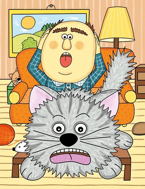 Po jídle se chtěl natáhnout na gauč. Vůbec si nevšiml, že se Elza schovává mezi polštáři. Těžce dosedl. Elzu to vymrštilo. Polekala se a s vřískotem vyskočila. Pan Mikulka se taky polekal. A jak! Srdce mu bušilo jako splašené.