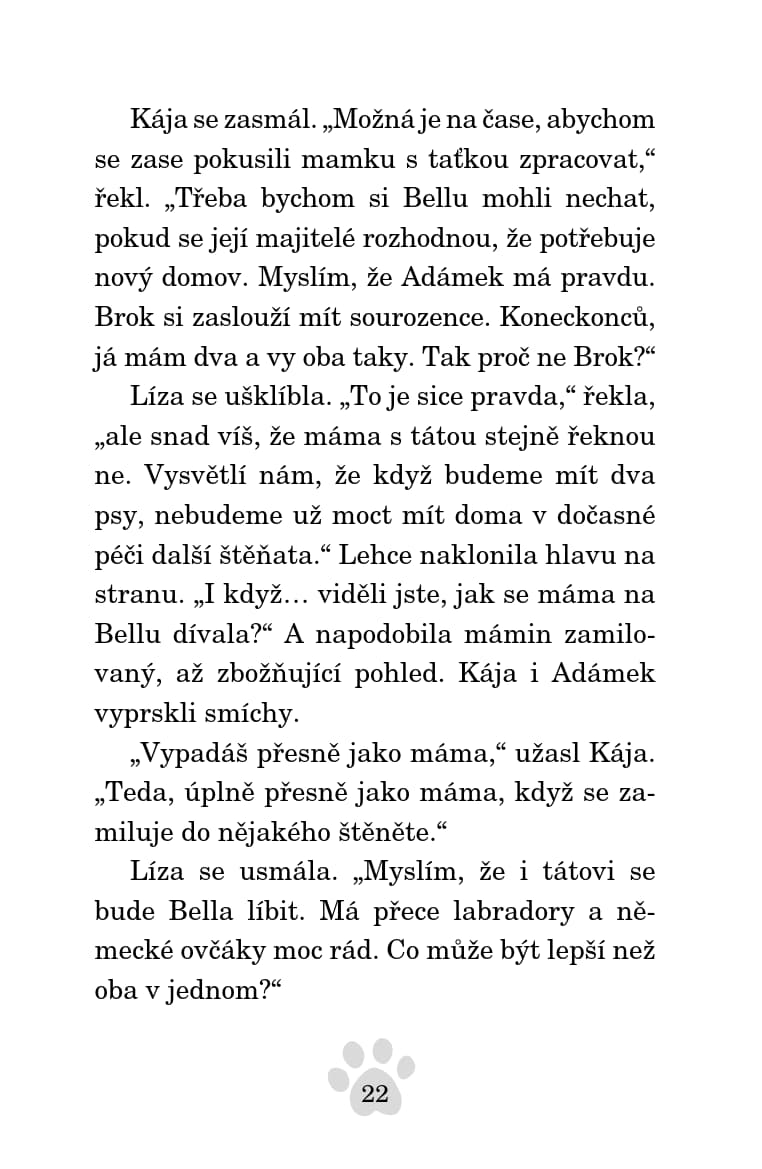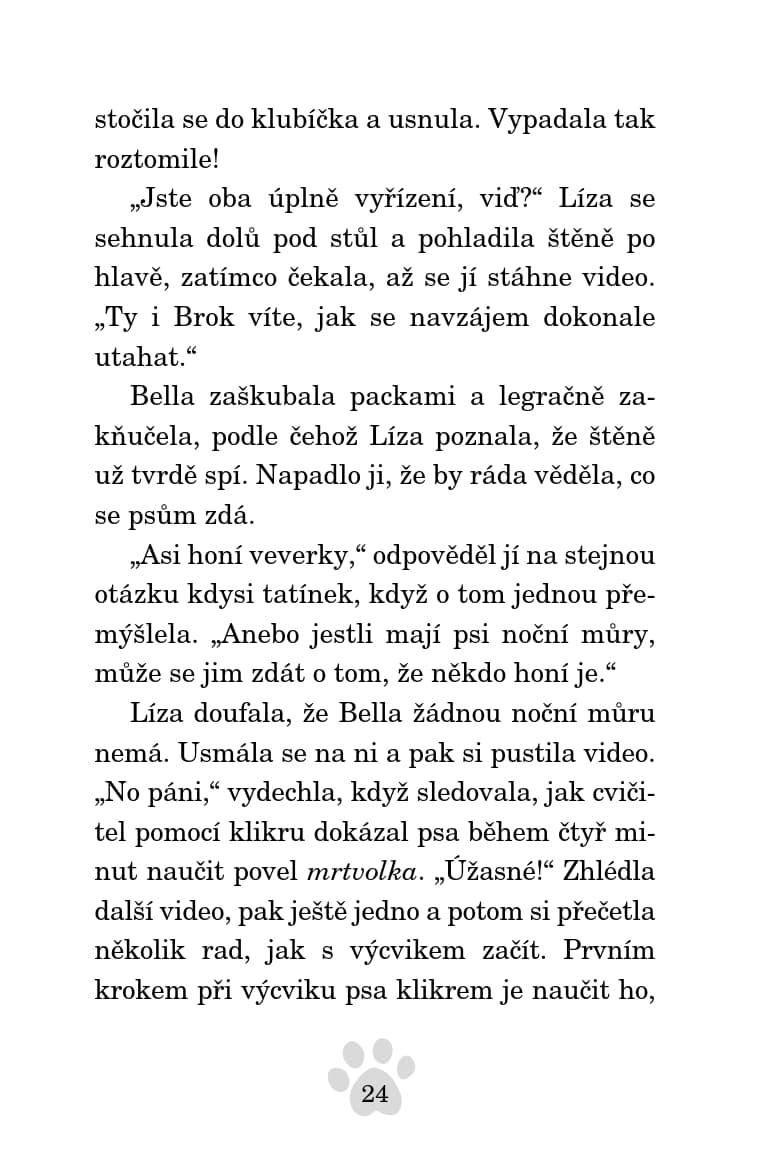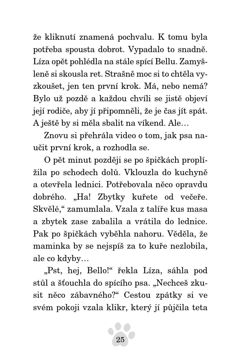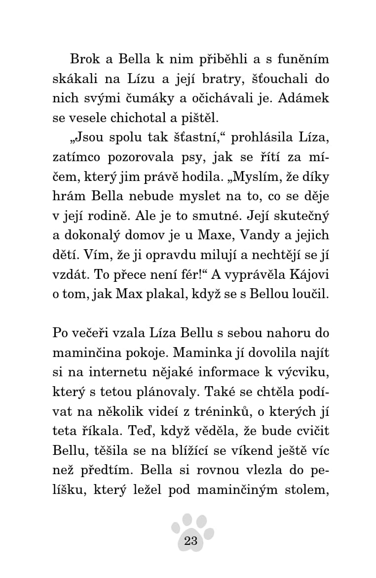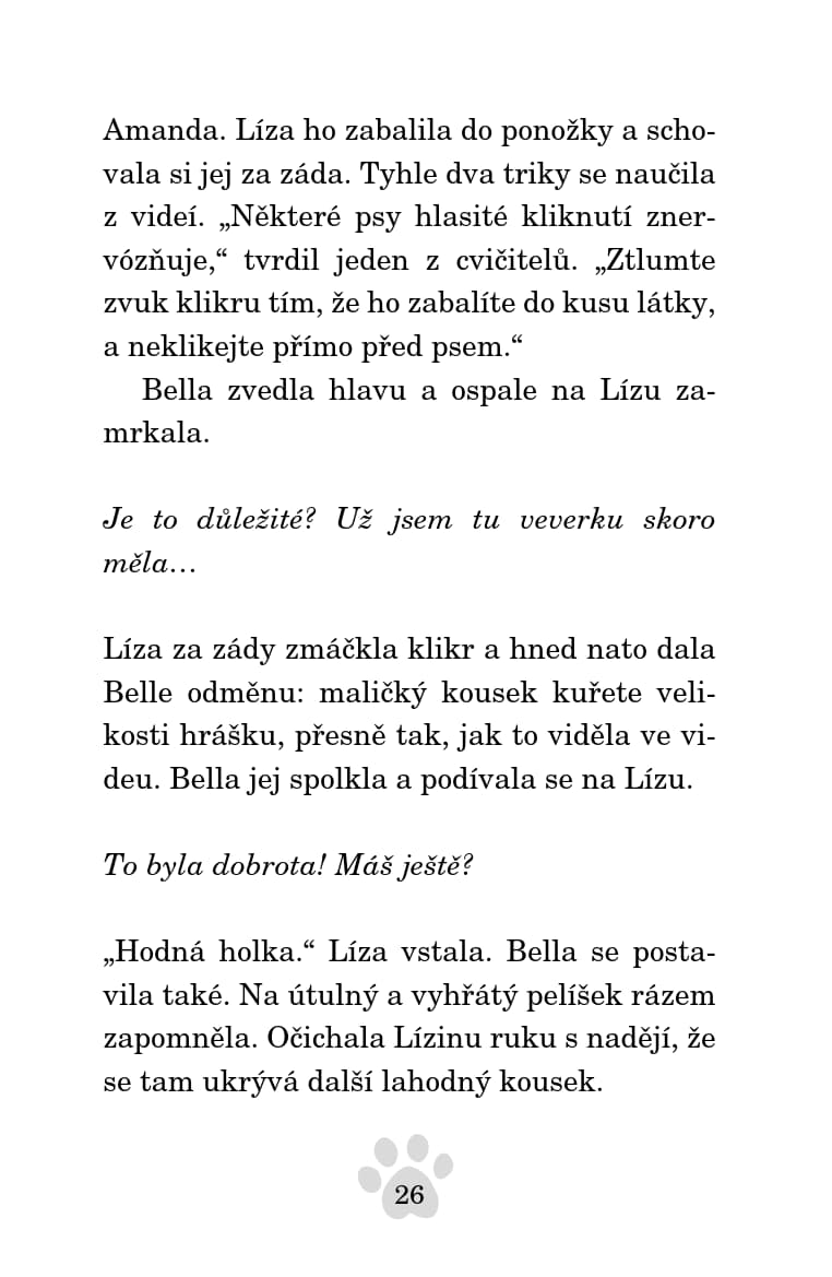 Líza se těší, až pojede s tetou Amandou na víkend do přírody, kde jí bude pomáhat ve výcvikovém kempu trénovat psy. Mají s sebou i Bellu, která asi bude brzy bez domova. Její rodina se totiž bude stěhovat do nového domu, ve kterém jeho majitel štěňata nechce. Líza se rozhodne, že s pomocí nově nabytých zkušeností z tréninku všem dokáže, že Bella je dobře vychovaná a vycvičená. Podaří se jí to?