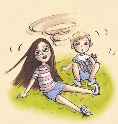 Natálka s Tomem ucítili, že dopadli na něco měkkého. Podívali se pod sebe, na čem to leží. Jasně zelená měkká tráva. Nat se zvedla z trávníku a pomohla na nohy i Tomovi.