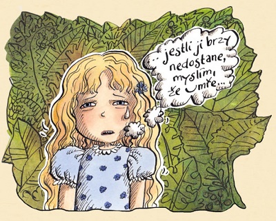 „Do lekárny? Jednak nevím, co to je, a jednak by se toho babička určitě lekla… A dotory u nás nevedeme. Když někdo stůně, tak užívá meducínu. A tu meducínu mu může dát jedině Kočkoláda. To nevíte?“ podivila se Lavandula.