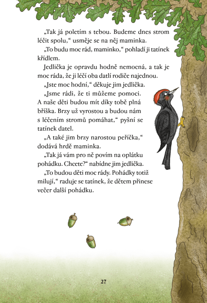 V dutině starého dubu žije šťastná datlí rodinka – rodiče a jejich čtyři čerstvě vylíhnutá ptáčátka. Tatínek s maminkou léčí přes den stromy v lese a shánějí potravu. Každý večer přinášejí svým dětem kromě pochoutek i jednu pohádku, kterou jim za odměnu vyprávěly vyléčené stromy.