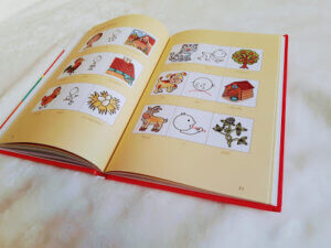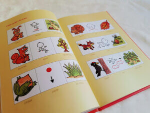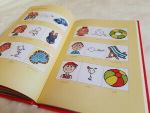 A poté už následuje obrázkové čtení. Pod každý obrázkem jsou napsány příklady vět, jak lze obrázky pochopit. Ale záleží na dítěti, jak to nakonec přečte. Může třeba zvolit trochu jiná slova nebo konkrétní pojmenování, může použít přítomný, minulý či budoucí čas, vybírá předložky a mnoho dalšího. Díky tomu se může číst příběh pokaždé jinak.