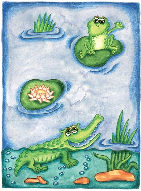Krokodýla ta ráznost nejprve překvapila, ale pak byl opravdu rád, že se ho nebojí. Ještě nezažil, aby před ním někdo neutíkal. Nabídnuté kamarádství rád přijal. Tak spolu v rybníčku žili pěkně pohromadě, jeden vedle druhého. Žáža se ráda vozila na Edových zádech, „vžžžc“ k jednomu břehu, „vžžžc“ zpátky. Nejraději ale oba měli koncerty, které pořádali za svitu měsíce. To se potom od rybníka ozývalo: „Kváák, kvááák.“ A do toho: „Chrum, chrumajdá,“ což byla Edova nejoblíbenější píseň.