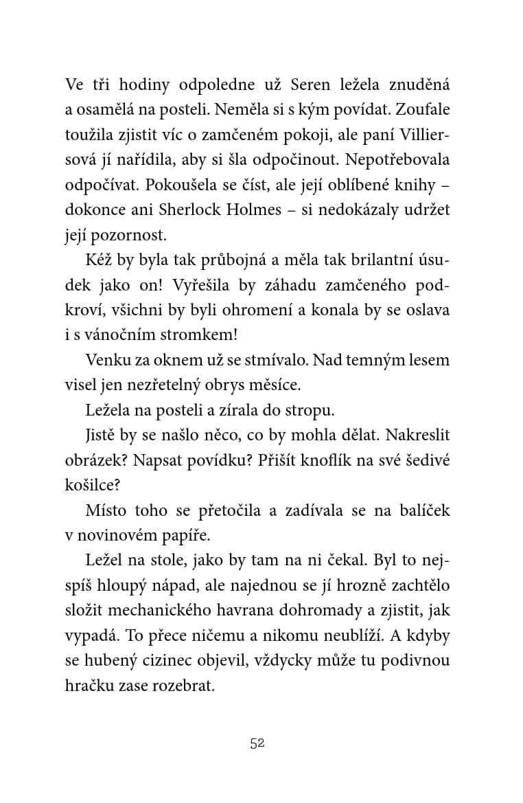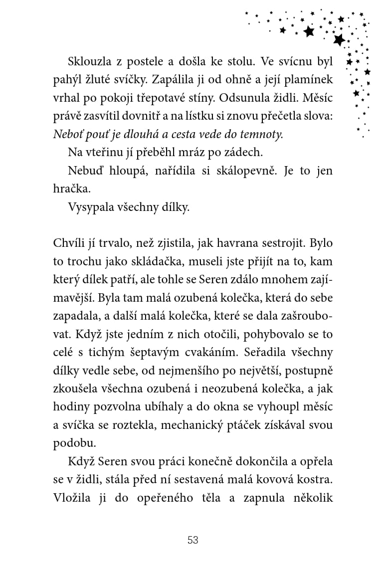 Když jedné zimní noci obdrží Seren Rhysová na mrazivém viktoriánském nádraží záhadný balíček od neznámého cestujícího, netuší, jaké potíže ji čekají. Na cestě za novým životem míří do odlehlého venkovského sídla. Po příjezdu však zjistí, že její představa veselých Vánoc byla jen klam. Vyzbrojená mluvícím ptákem, jehož slova možná nejsou pravdivá, kouzelným sněžítkem a vlastní odvahou se Seren vydává na nebezpečnou půlnoční výpravu do začarovaného světa sněhu a hvězd. Jejím cílem je vrátit sem ztracené štěstí.