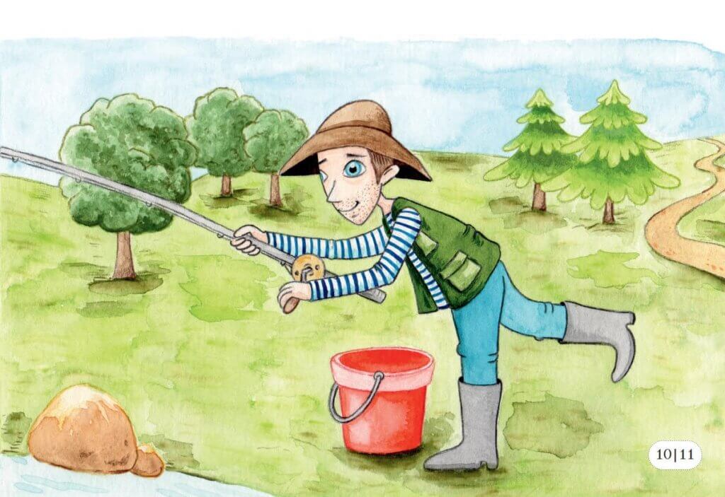 „Já jsem Kuba,“ představil se rybář. Měl dobré srdce, nechtěl, aby se ho skřítek bál, a tak ho pustil. Posadil se na břeh a vlídně se usmál. „Kam máš namířeno?“ zeptal se, když Vltavínek sám nic neříkal.