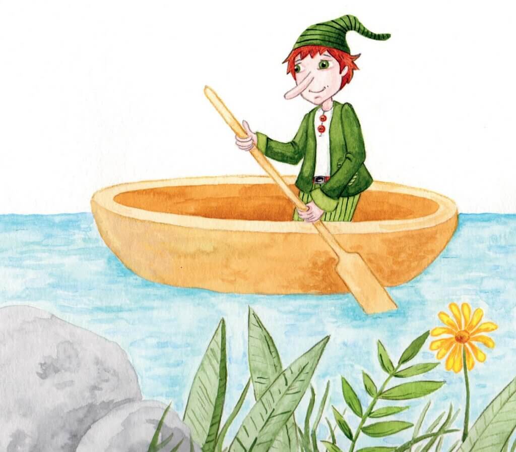V řezbářské dílně to krásně vonělo dřevem. Na zemi ležely měkké hoblinky a na policích stály hotové výrobky – misky, naběračky, lžíce, svícny, ale taky dřevěné sochy. Zatímco si skřítek všechno důkladně prohlížel, Kuba se pustil do práce. Našel si kus dřeva a tím skřítka měřil jako krejčí, když bere míru na šaty. Pak už se ozývalo jen řezání pilkou, hoblování a ťukání kladiva do dlátka. A než se Vltavínek nadál, lodička byla hotová.