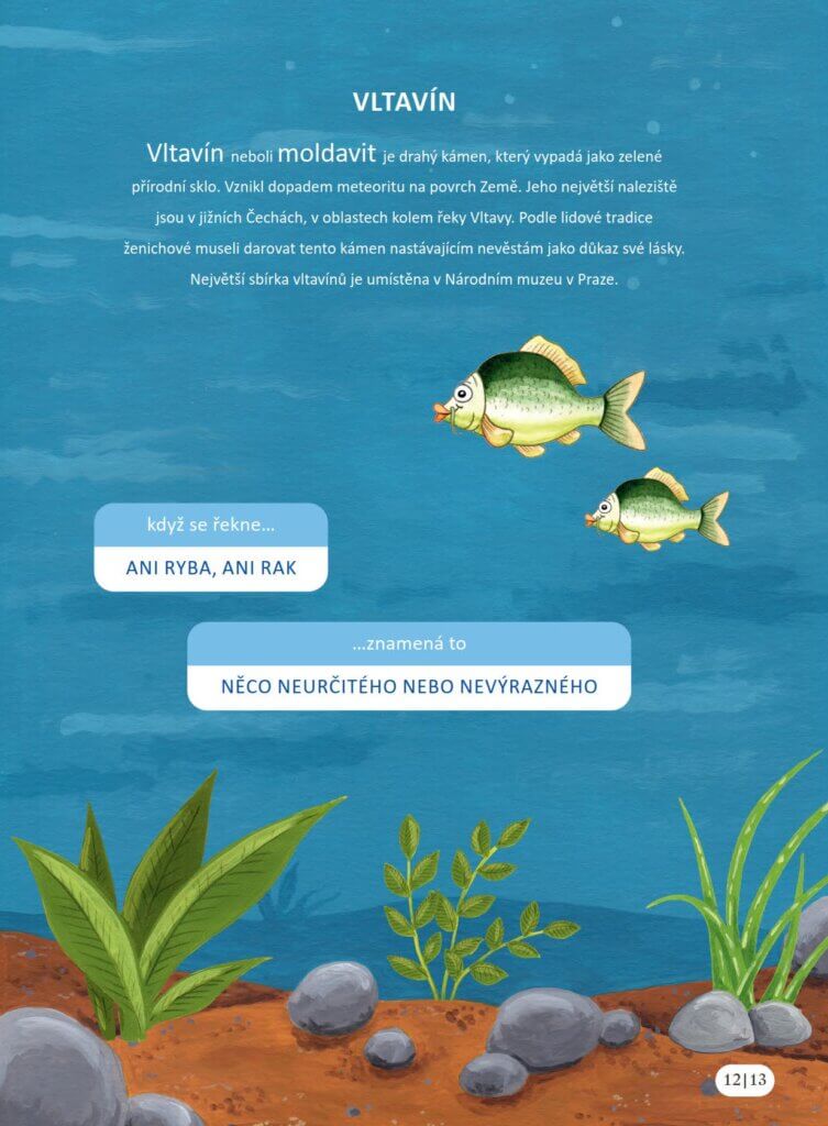 „Páni, to je nádhera. Jak já se ti za to jenom odvděčím?“ přemýšlel nahlas Vltavínek a začal si prohledávat kapsy svého kabátku. Nahmatal zelený, průhledný a nepravidelný kamínek – vltavín. Bez váhání ho podal Kubovi.