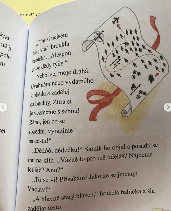 „Uhasili oheň, popadli batohy a pokračovali dál. Dědeček se v jednu chvíli zastavil. Podíval se zase do mapy a poškrábal se na hlavě. Před nimi byly ne dvě, ale hned tři cesty.