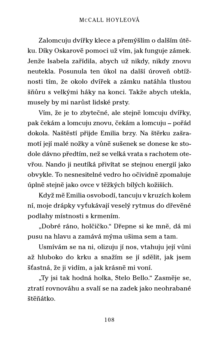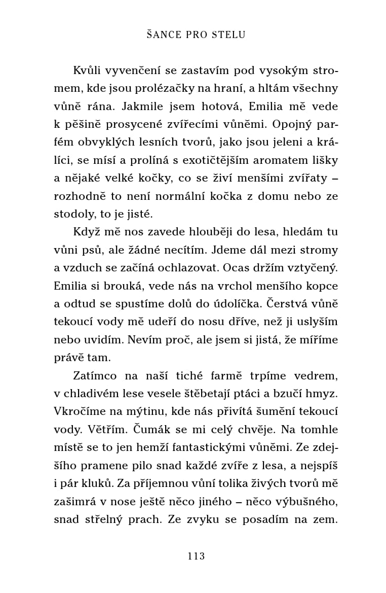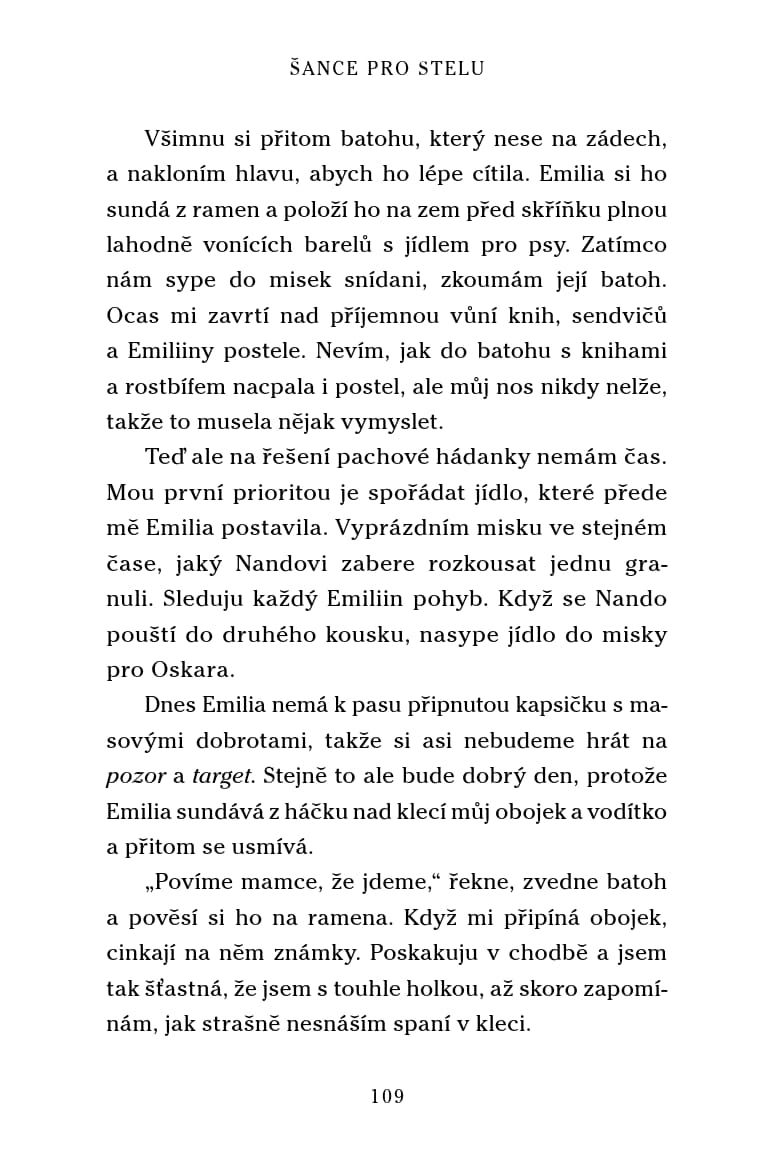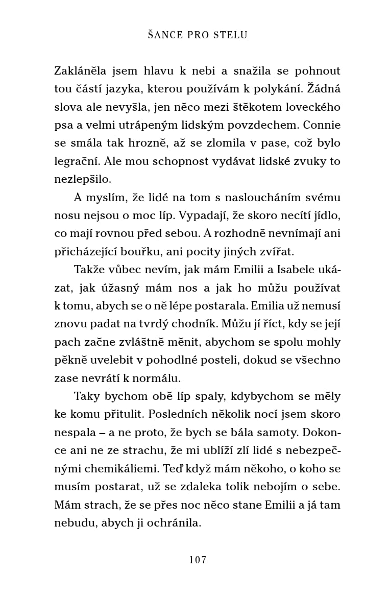 Když se jí ujme dívka jménem Emilia, fenka ví, že je to její poslední šance, aby ukázala své schopnosti. Jednou Stela ucítí z Emiliina těla zvláštní pach, který zesílí těsně předtím, než se dívenky zmocní epileptický záchvat. Stelin nos si uvědomí souvislost. Jenže jak má příště varovat svou novou rodinu, aniž by v ní vzbudila dojem, že má jen další záchvat paniky? Chce všechny přesvědčit, že může znovu pracovat jako signální pes, který umí upozornit na skryté nebezpečí. Dokáže to?