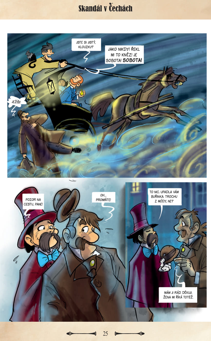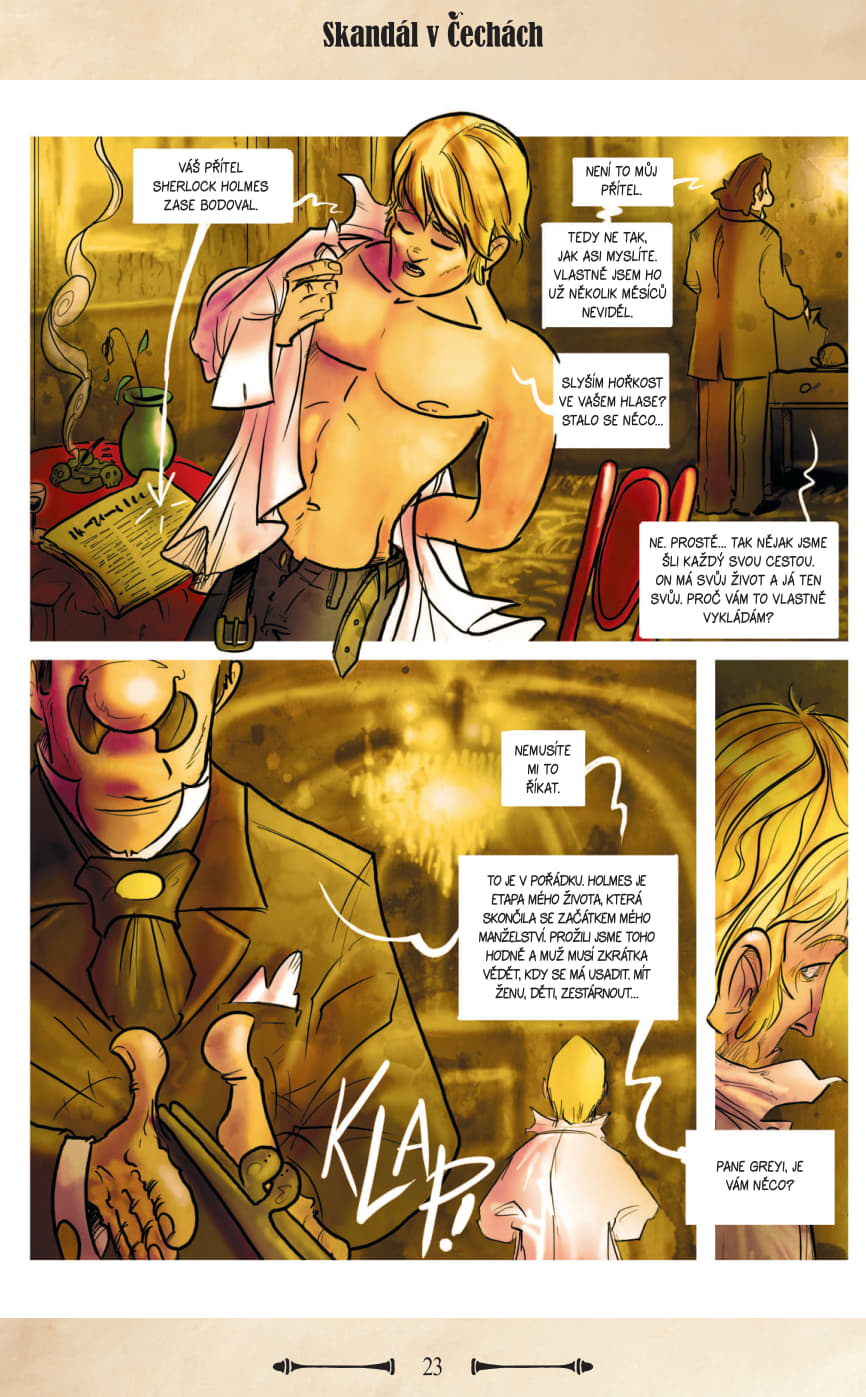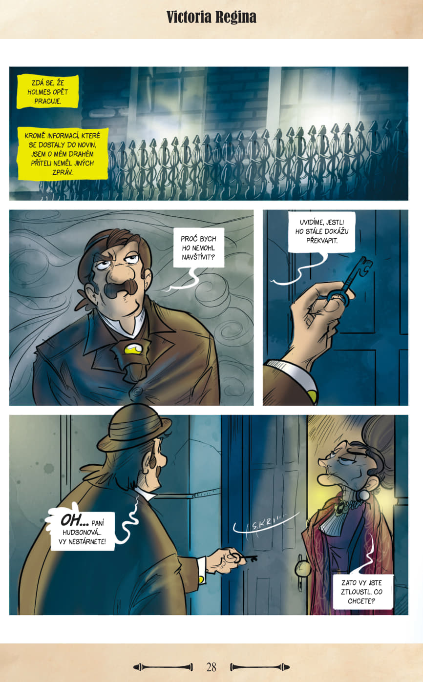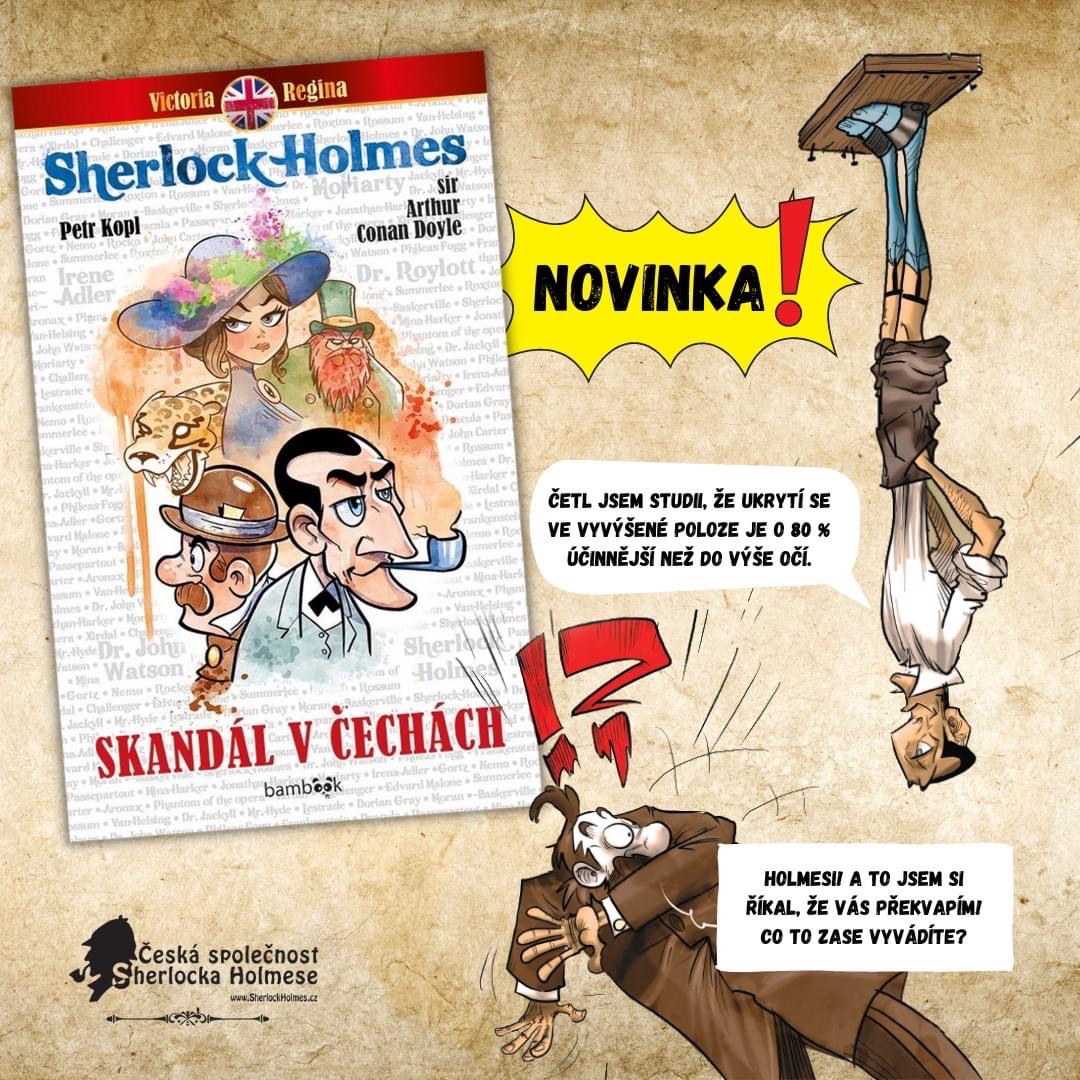 Detektiv Sherlock Holmes vyšetřuje skandál v Čechách. Podaří se mu i tentokrát vše brilantně vyřešit? V této komiksové adaptaci se proplétá hned několik případů. Název prvního z nich – Skandál v Čechách – dal jméno i celé knize. Druhý příběh – Strakatý pás – přivádí Sherlocka Holmese i dr. Watsona na anglický venkov, kde nebývá nouze o nejrůznější překvapení. Petr Kopl zachází s předlohou volně, ale drží se jádra příběhu, a pokud někde něco přidá, otevírá si tím dvířka do světa dalších mystifikací; stále však zůstává v době končícího 19. a začínajícího 20. století, kterou nazývá Victoria Regina.