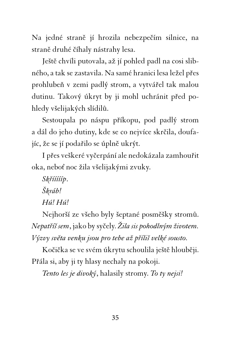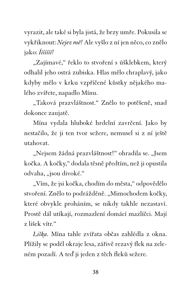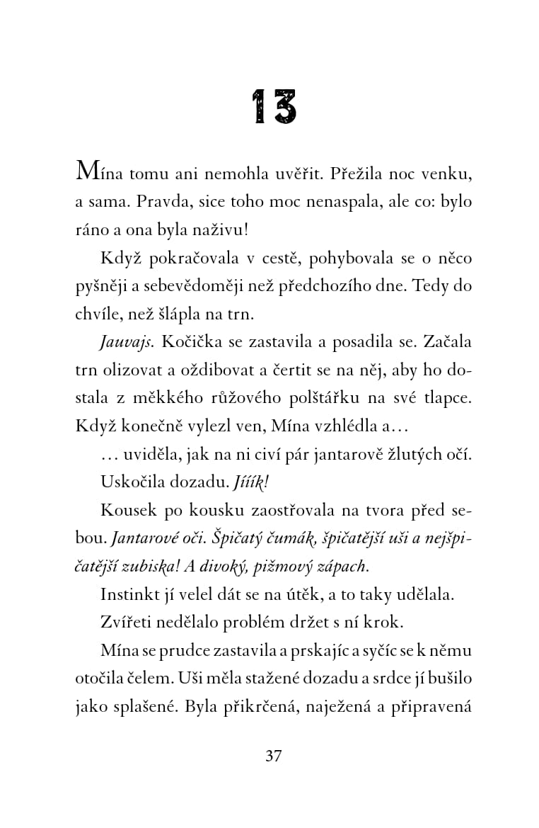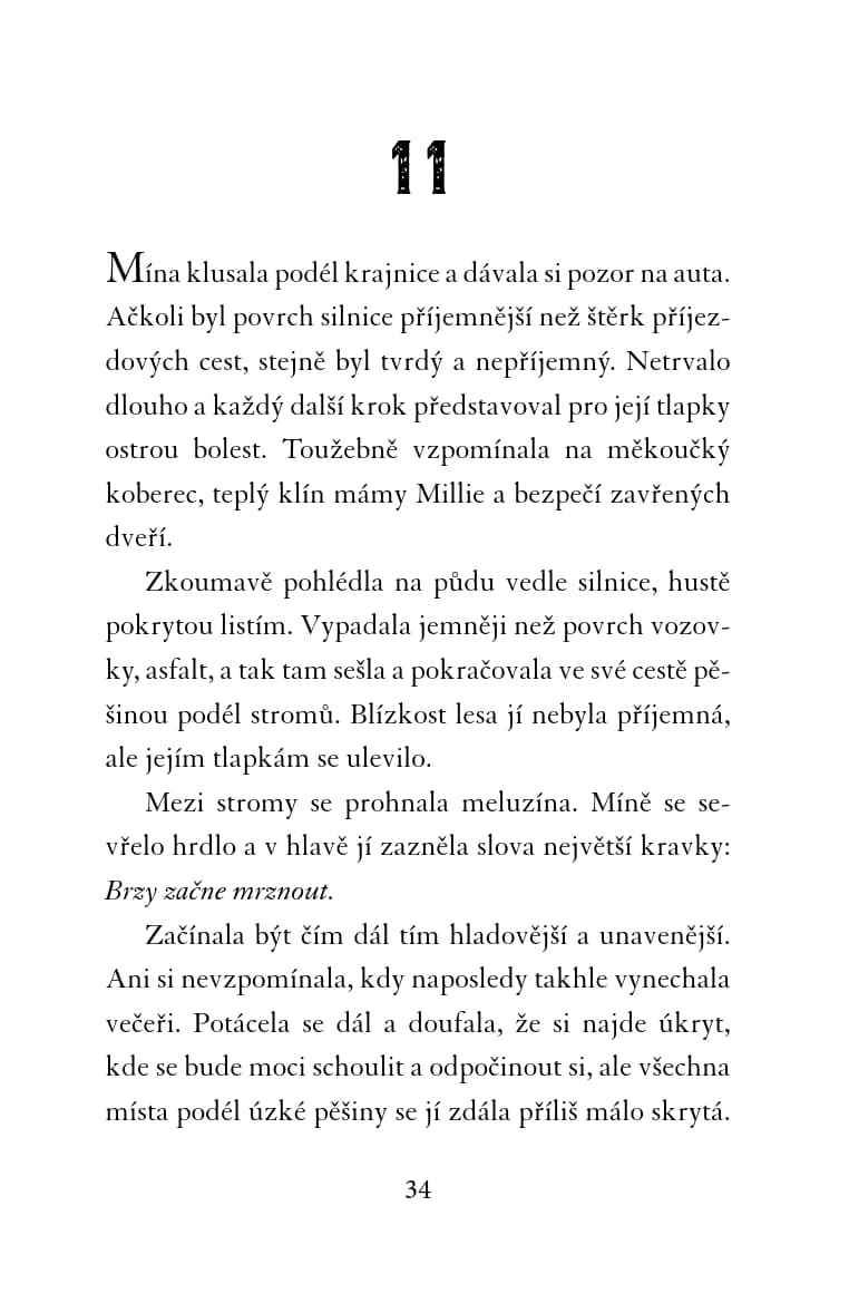 Teplá a útulná náruč mámy Millie, vůně čerstvě upečeného chleba, chutné jídlo podávané v modré misce – to všechno pro kočičku Mínu znamená domov. Když máma Millie náhle onemocní, pohodlný život se Míně rázem obrátí vzhůru nohama. Mína by pro svého milovaného člověka udělala cokoli, a tak vyrazí do města pro pomoc! Naléhavé poslání ji zavede do stinného a nepřátelského lesa. Všechny nástrahy neznámé divočiny jí naštěstí pomáhá překonávat nečekaný spojenec – liška. Jenže Mína netuší, že je sleduje tvor nejnebezpečnější… V patách je jim rys.