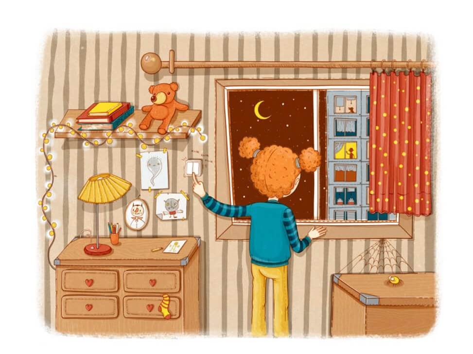 Magda bydlela se svým mladším bráškou v šestém patře panelového domu. Bydlet tak vysoko je velká výhoda, hlavně když potřebujete mít dobrý výhled z okna. Magda z toho svého dohlédla až do parku. A nejenom to. Viděla také na okna kamarádů Terezky a Vojty, kteří bydleli v sousedním paneláku. Díky tomu se každý večer mohli domlouvat blikáním světla.