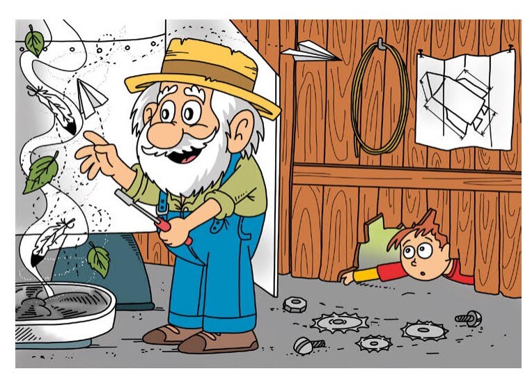 Nakoukl jsem do dílny dírou pod dveřmi. Bylo vidět, že děda něco montuje. K malému ventilátoru přidělal trychtýř. Pustil ventilátor a do trychtýřku hodil kus papíru, papír vzlétl a spadl za stolem na zem. Vážně jsem se polekal, tomuto přístroji bych nesvěřil ani unaveného motýla, natož sebe. Děda spokojeně vyšel před dílnu, dělal jsem, že jsem nic neviděl. Nejistě jsem se zeptal: „Dědo, nemám začít něco trénovat? Ve spánku nadnáší sen, ale když poletíme přes den? Co budeme potřebovat?“