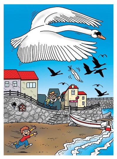 „Co se jednou dotkne země, už ztratí kouzlo lítání!“ A vysypal z váčku podle něj pokažená pírka. Děda znovu tleskl. Pak běhal po náplavce, málem spadl do vody, ale přesto chytil několik dalších pírek, které vypadly polekaným ptákům z křídel, nakoukl do váčku a byl spokojený. „Máme štěstí, máme sakra štěstí!“ Mezi zachycenými pírky bylo i jedno velké
