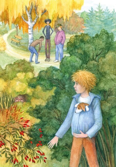 V ten moment zahlédl koutkem oka rychlý pohyb. Vylekaně se otočil a uviděl, jak se někdo schovává mezi hustými keři jen kousek od něj. Seneka vycítil jeho strach a začal kňučet. Viktor mu okamžitě stiskl tlamičku a schoval ho pod mikinu. „Pst, buď zticha, nebo nás prozradíš.“