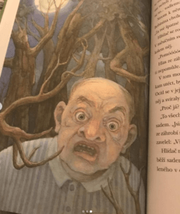 „Všichni tři zkameněli a zírali na něj. Takovou zradu nečekali. Viktorovi se podlomily nohy. Luna ho ale podepřela a pošeptala mu: „Neboj se, Viktore, dopadne to dobře.“ Nahlas pak pokračovala: „Promiňte, museli jsme se splést.“