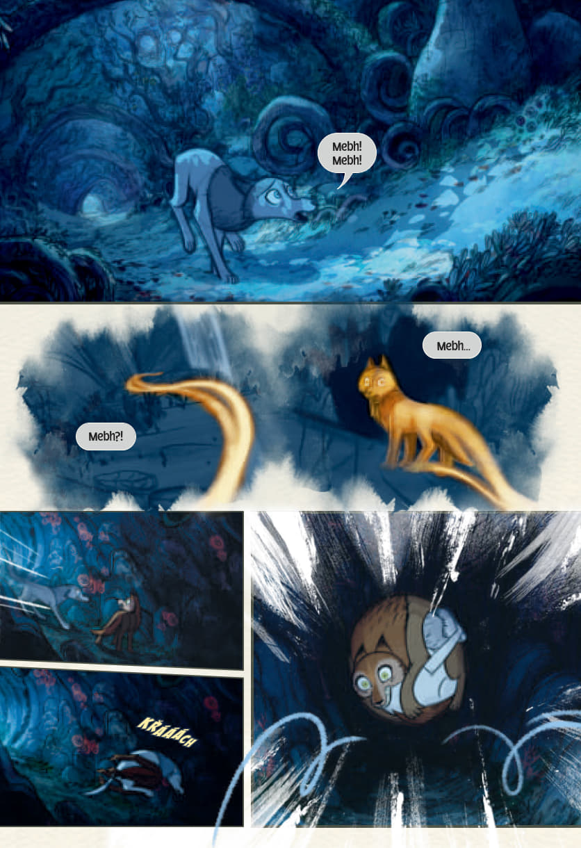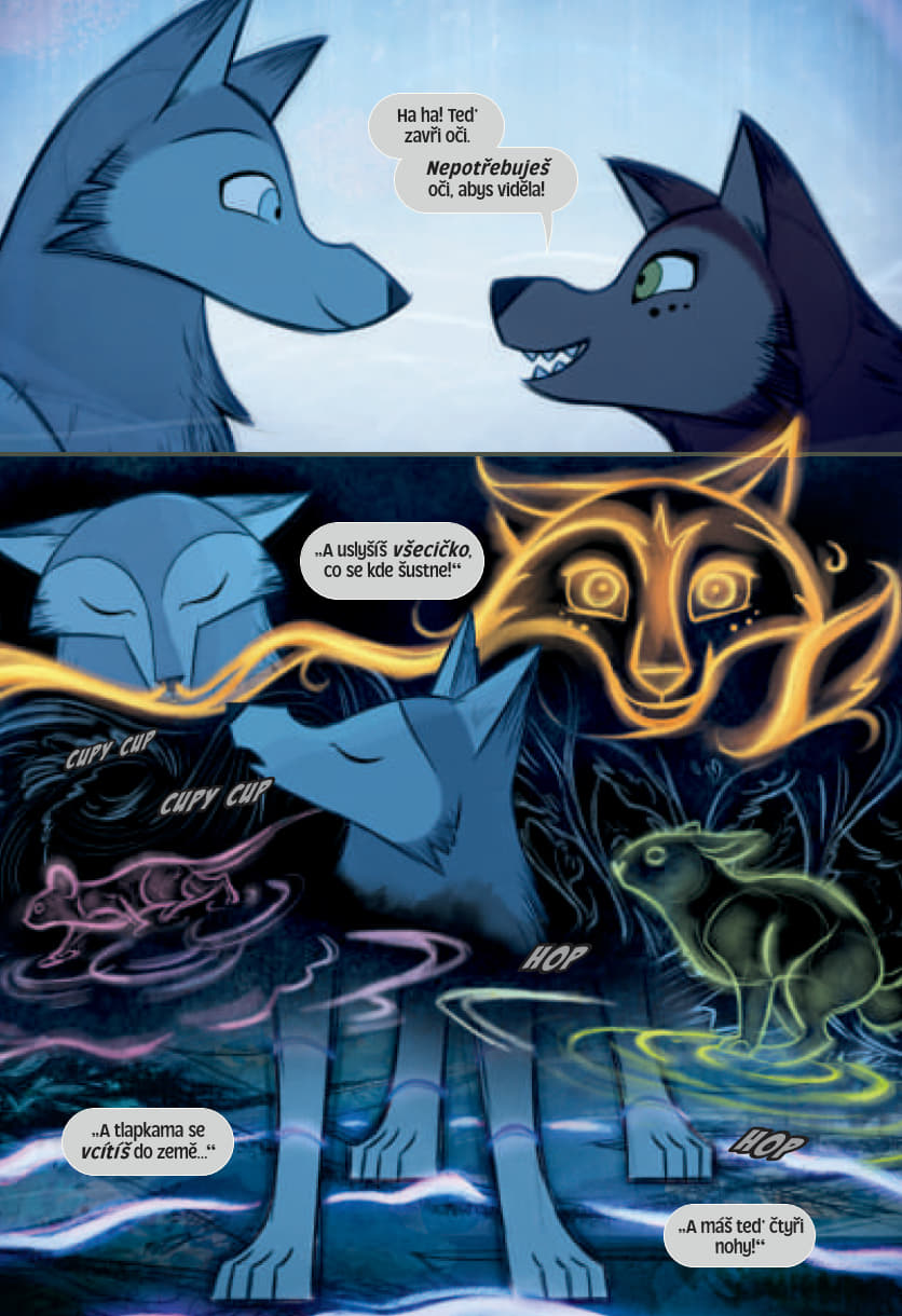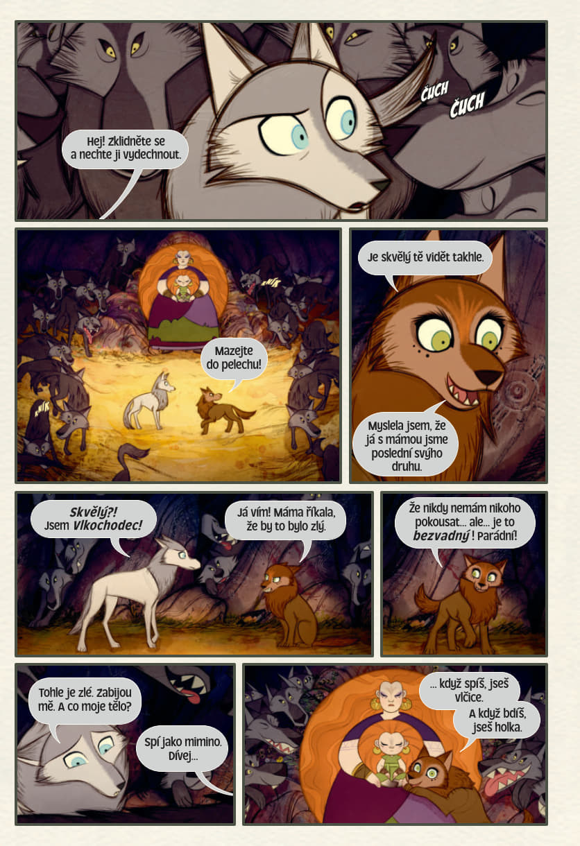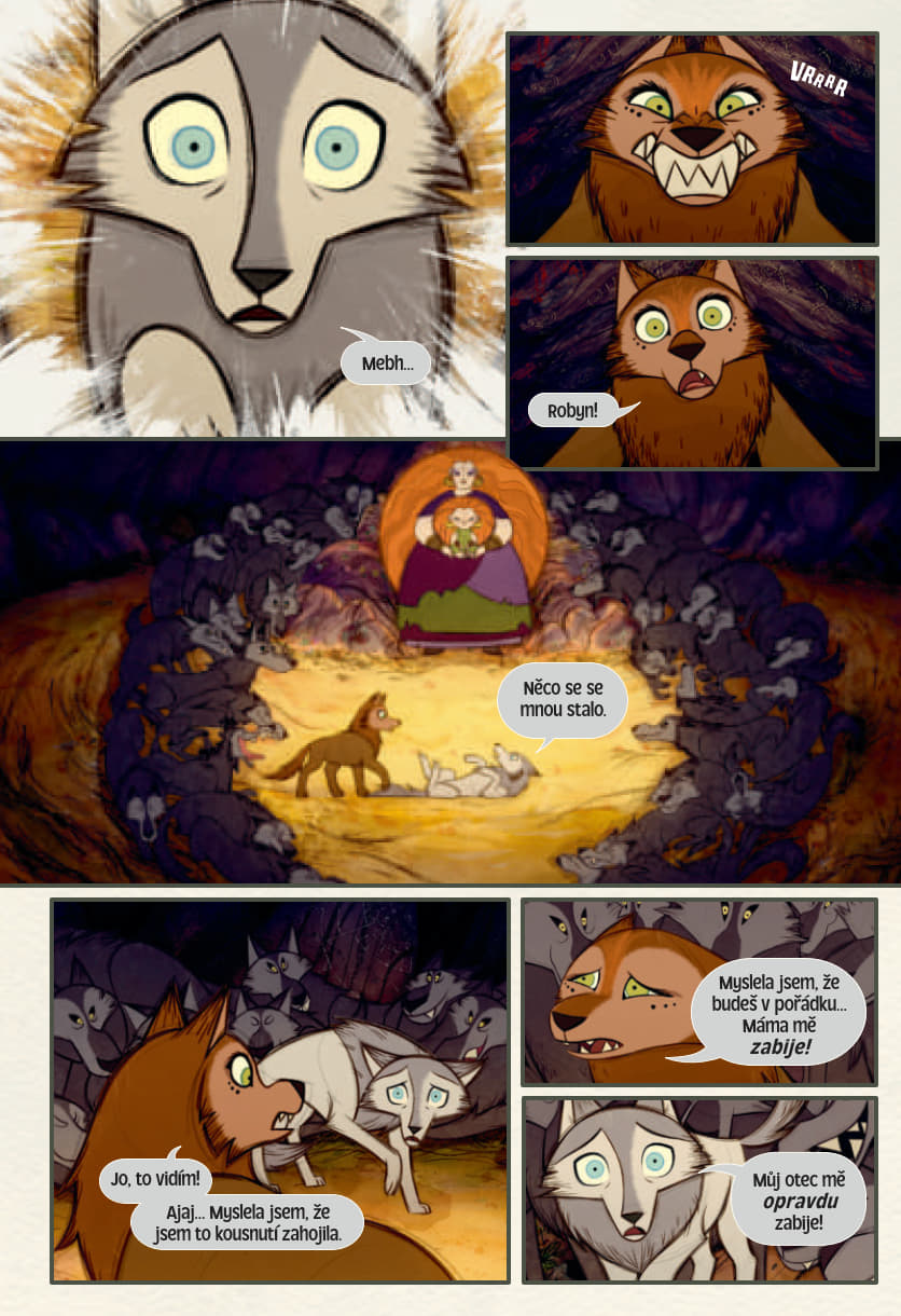 Jednoho dne se proto vydá do divočiny na vlastní pěst. Hned na okraji lesa ji ale přepadne vlčí smečka, a nebýt divoženky Mebh, kdo ví, jak by to dopadlo. Obě dívky se záhy skamarádí a Mebh Robyn ukáže, jak vypadá život v lese mezi divokými šelmami. Patří totiž mezi Vlkochodce – starý keltský kmen, jehož členové jsou schopni měnit se ve vlky.