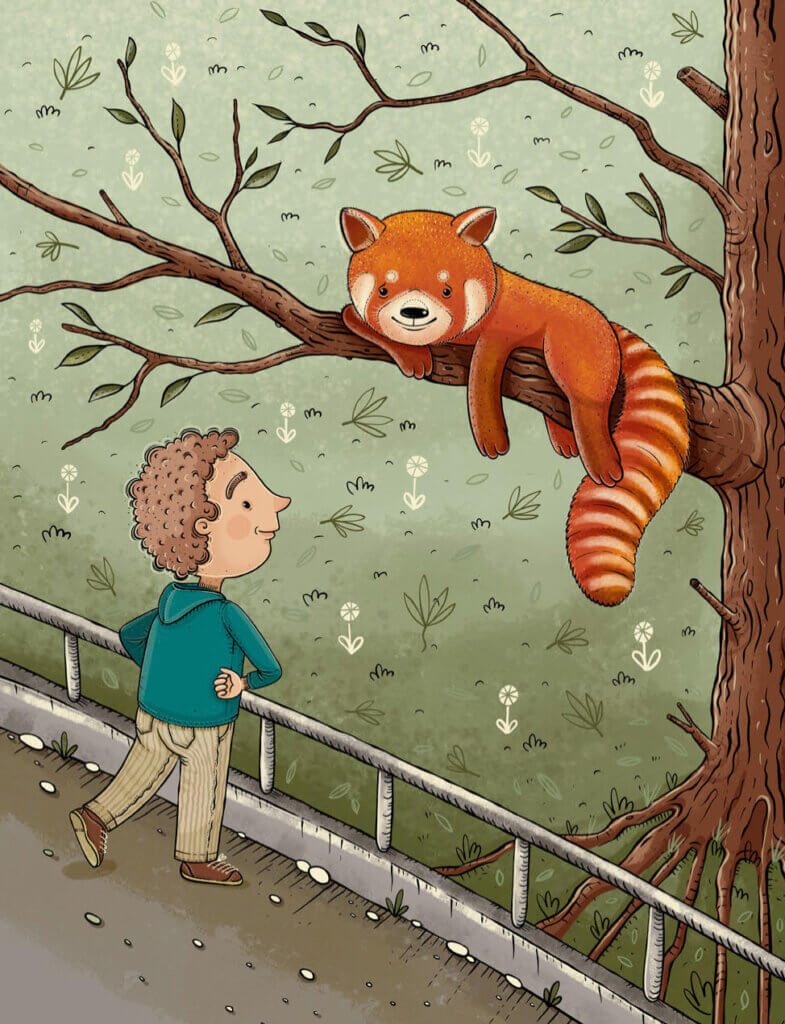 Panda seděla na větvi stromu. Před ní stál klučina a povídali si. Myslel jsem, že řeč zvířat umím jenom já. Ale jak vidím a slyším, umí to i některé malé děti. Nechtěl jsem ty dva v povídání rušit. A tak jsem si šel ke stánku koupit párek v rohlíku. Když jsem se vrátil, ptala se panda klučiny: „A kolik je ti let?“ „Čiži,“ řekl klučina. „Ale říkám to takhle proto, že se to velkým líbí. Už to umím správně i slabikovat: bu-dou mi čty-ři.“ „A jak se jmenuješ?“ zeptala se ho panda. „Fanda.“ „A já jsem panda,“ řekla panda. „Panda a Fanda, to je fakt legrace. Ale já nejsem jenom panda. Já jsem panda červená.“ „A já jsem Fanda Červenka.“ To už byla taková legrace, že jsem se musel smát i já.